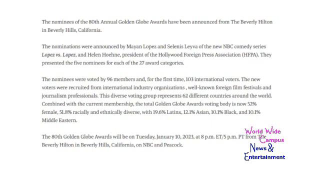 For this week on “What’s on World Wide Campus?”, here are the today’s topic for the nominations for the 80th Golden Globes have been announced. #GoldenGlobes The nominees of the 80th Annual Golden Globe Awards have been announced from The Beverly Hilton in Beverly Hills, California. The nominations were announced by Mayan Lopez and Selenis Leyva of the new NBC comedy series Lopez vs. Lopez, and Helen Hoehne, president of the Hollywood Foreign Press Association (HFPA). They presented the five nominees for each of the 27 award categories. The nominees were voted by 96 members and, for the first time, 103 international voters. The new voters were recruited from international industry organizations , well-known foreign film festivals and journalism professionals. This diverse voting group represents 62 different countries around the world. Combined with the current membership, the total Golden Globe Awards voting body is now 52% female, 51.8% racially and ethnically diverse, with 19.6% Latinx, 12.1% Asian, 10.1% Black, and 10.1% Middle Eastern. The 80th Golden Globe Awards will be on Tuesday, January 10, 2023, at 8 p.m. ET/5 p.m. PT from The Beverly Hilton in Beverly Hills, California, on NBC and Peacock. Check out for this article on Today Show→ https://www.today.com/popculture/awards/golden-globes-2023-nominees-full-list-rcna60764 Also, you check out and see more on the Golden Globes for this nominees as well→ https://www.goldenglobes.com/articles/golden-globes-2023-nominations-80th-golden-globes-have-been-announced Check out and follow Golden Globes profile on the link below: Main Website: https://www.goldenglobes.com/ Facebook: https://www.facebook.com/GoldenGlobes Twitter: https://twitter.com/goldenglobes YouTube: https://www.youtube.com/channel/UCvdrYSJ1itgZEH19wWnSHcg Instagram: https://www.instagram.com/goldenglobes/ Pinterest: https://www.pinterest.com/crrlwilliams82/golden-globe-award/