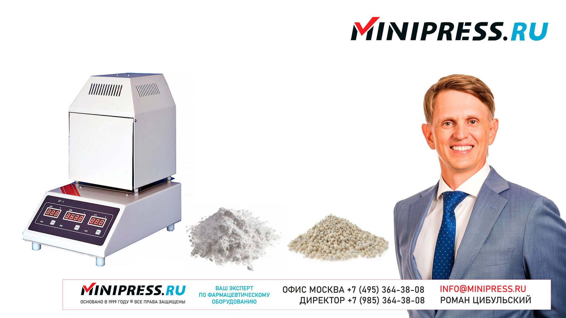 Лабораторный анализатор влажности порошков и гранул SF-01 https://Minipress.ru/katalog/ Фармацевтическое оборудование. Специалисты в фармацевтическом оборудовании и технологиях производства лекарств. Более 20 лет оказываем нашим клиентам помощь в выборе, поставке, наладке различного фармацевтического оборудования! Вы в поиске надежного поставщика оборудования? Мы предоставим вам лучший сервис 24/7. Собрана лучшая команда профессионалов в фармацевтической отрасли и налажены стабильные связи с лучшими производителями. Мы не только продаем, но и производим многие модели оборудования Директор компании Минипресс Роман Цибульский Поставка фармацевтического оборудования в Россию Пишите: info@minipress.ru Телефон +7(495)364-38-08; Мобильный +375(29)308-00-00 Россия, Москва Skype: RomanTsibulsky; ICQ: 310-134-490 Подписывайтесь на наш видео канал на Youtube https://youtube.com/user/wwwMinipressru Обновленный сайт https://Minipress.ru Каталог оборудования https://Minipress.ru/katalog/ МЫ В СОЦИАЛЬНЫХ СЕТЯХ G+ https://plus.google.com/+RomanTsibulsky/ FB https://facebook.com/roman.tsibulsky YOUTUBE https://youtube.com/user/wwwMinipressru IN https://ru.linkedin.com/pub/roman-tsibulsky/a6/933/661 БОЛЬШОЙ КАТАЛОГ ФАРМАЦЕВТИЧЕСКОГО ОБОРУДОВАНИЯ https://minipress.ru/katalog/ Постоянно обновляемый каталог различного фармацевтического оборудования с фотографиями, описаниями, видео и ценами. ПЕРСОНАЛЬНЫЙ МЕНЕДЖЕР 24 ЧАСА https://minipress.ru/katalog/ Вы общаетесь по всем вопросам, с момента первой консультации и до получения оборудования, с одним специалистом. СПЕЦИАЛИСТЫ И ТЕХНОЛОГИ https://minipress.ru/katalog/ Имеем обширные связи в фармацевтической среде, найдем любого специалиста, поможем с освоением оборудования и технологий. ОБСУЖДЕНИЕ ВАШИХ ИДЕЙ ПО ПРОИЗВОДСТВУ ПРОДУКЦИИ https://minipress.ru/katalog/ Поможем в оценке ваших идей. Большой опыт в организации различных производств и выпуске продукции. Ценные советы. ФАРМАЦЕВТИЧЕСКОЕ ОБОРУДОВАНИЕ Мы поставили перед собой задачу, помогать нашим клиентам в правильном выборе фармацевтического оборудования. Многолетний опыт подобной деятельности показывает, что многие клиенты сталкиваются, в первую очередь, с непониманием технологического процесса. Покупка оборудования должна быть финальной точкой после подробного обсуждения задачи, консультацией с производителем оборудования, отправкой сырья и материалов на фабрику, тестирования в работе. ДЛЯ ТАБЛЕТОК https://minipress.ru/katalog/category/farmacevticheskoe_oborudovanie/ Смешивание порошков, гранулирование, прессование, обеспыливание, покрытие оболочками, фасовка, упаковка, счет, нанесение логотипов ДЛЯ ЖЕЛАТИНОВЫХ КАПСУЛ https://minipress.ru/katalog/category/farmacevticheskoe_oborudovanie/kapsulyatory-dlya-tverdyh-zhelatinovyh-kapsul/ Фасовка порошков и масел, обеспыливание, счет и фасовка, упаковка, нанесение логотипов. ФАСОВКА И УПАКОВКА https://minipress.ru/katalog/category/upakovochnoe_oborudovanie/ Упаковка в пластиковые и стеклянные флаконы, блистер, фольгу, ламинированную бумагу, стеклянные ампулы, саше, стрипы, тубы, тюбики, контурную ячейку. ТЕХНОЛОГИЧЕСКОЕ https://minipress.ru/katalog/category/eksperimentalnoe-oborudovanie/ Лабораторное, аналитическое, подготовительное, отдельные машины и линии под ключ. СФЕРЫ ДЕЯТЕЛЬНОСТИ Наша компания занимается множеством направлений фармацевтического бизнеса! Предлагаем Вам посетить страницы нашего сайта https://www.Minipress.ru по различным специализациям. ОБОРУДОВАНИЕ ДЛЯ НАКЛЕЙКИ ЭТИКЕТОК НА БУТЫЛКИ АМПУЛЫ ФЛАКОНЫ https://minipress.ru/katalog/oborudovanie-s-otzyvami/oborudovanie-dlya-naklejki-etiketok-na-butylki-ampuly-flakony/ Автоматическое этикетировочное оборудование для этикеток на клеевой 