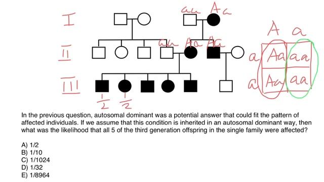 Mitochondrial diseases can be caused by genetic mutations in the body's nuclear DNA. Mitochondrial diseases are a group of disorders that affect the function of mitochondria, which are the energy-producing structures within cells. While mitochondria have their own DNA (mtDNA), the majority of their genetic material is located in the cell's nucleus (nuclear DNA). Mutations in both nuclear DNA and mtDNA can contribute to mitochondrial diseases. Here are some examples of mitochondrial diseases caused by mutations in nuclear DNA: Leigh Syndrome: Leigh syndrome is a severe neurological disorder that can be caused by mutations in nuclear DNA. Mutations in genes involved in mitochondrial function, such as genes encoding proteins required for mitochondrial assembly or maintenance, can lead to impaired energy production and neurological symptoms. NARP Syndrome: Neuropathy, Ataxia, and Retinitis Pigmentosa (NARP) syndrome is caused by mutations in nuclear DNA. This disorder affects multiple systems, including the nervous system and the eyes, and is often associated with a decreased ability of mitochondria to produce energy. Pyruvate Dehydrogenase Complex Deficiency: This disorder is caused by mutations in genes that encode components of the pyruvate dehydrogenase complex, which is crucial for energy production. Mutations in nuclear DNA affecting this complex can lead to a buildup of lactic acid in the body and neurological symptoms. Coenzyme Q10 Deficiency: Coenzyme Q10 (CoQ10) is a molecule essential for mitochondrial function and energy production. Mutations in nuclear DNA affecting genes involved in CoQ10 biosynthesis or utilization can result in CoQ10 deficiency and mitochondrial dysfunction. Mitochondrial Myopathy: Some forms of mitochondrial myopathy can be caused by mutations in nuclear DNA. These mutations can affect proteins involved in muscle cell function and energy production, leading to muscle weakness and other symptoms. Complex I Deficiency: Complex I is a part of the electron transport chain in mitochondria, and mutations in nuclear DNA affecting genes encoding its components can lead to Complex I deficiency, resulting in energy production deficits and mitochondrial disease. Barth Syndrome: Barth syndrome is an X-linked genetic disorder caused by mutations in a nuclear DNA gene called TAZ. It affects various systems in the body, including the heart and skeletal muscles, leading to muscle weakness, cardiomyopathy, and other symptoms. These examples illustrate how mutations in nuclear DNA can disrupt mitochondrial function and lead to various mitochondrial diseases. It's important to note that mitochondrial diseases can result from a complex interplay of genetic factors, including mutations in both nuclear DNA and mtDNA, as well as environmental factors. Questions: Which of the following options is the most likely explanation of the above pedigree. A) Autosomal Recessive B) Mitochondrial C) X-linked recessive D) Autosomal Dominant E) Y-linked In the previous question, autosomal dominant was a potential answer that could fit the pattern of affected individuals. If we assume that this condition is inherited in an autosomal dominant way, then what was the likelihood that all 5 of the third generation offspring in the single family were affected? A) 1/32 B) 1/8964 C) 1/2 D) 1/1024 E) 1/10 Mitochondrial disease can manifest due to mutations in the genomic or mitochondrial DNA. Therefore the phenotype of the disease isn’t sufficient to predict the inheritance pattern. However, which of these symptoms might increase your suspicions that this is a sign of mitochondrial mutation? There are multiple correct answers here, can you get them all? A) muscle weakness B) developmental delay C) vision problems D) scleroderma E) arthritis F) gout G) asthma H) poor growth https://www.youtube.com/watch?v=uzhHpih0b18