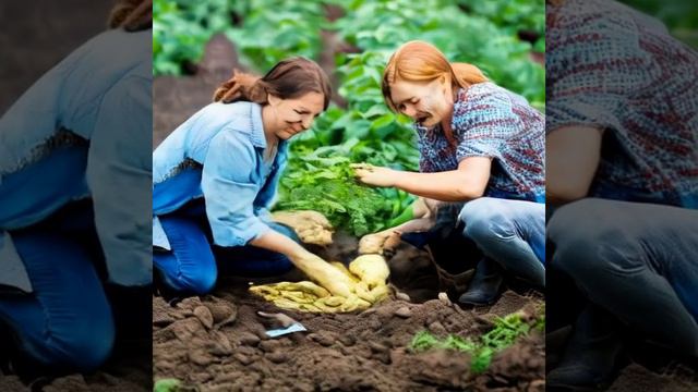 Люди на огороде с картошкой, создано нейросетью