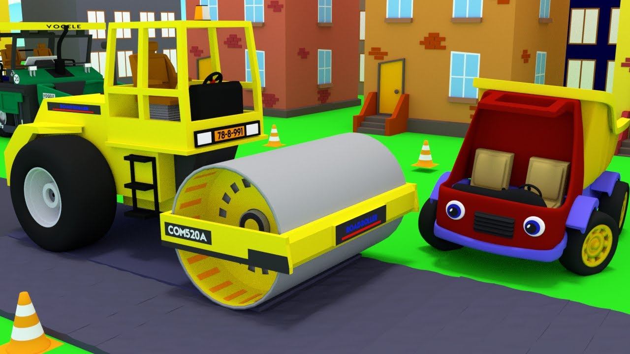 Мультики про машинки для малышей. Грузовик Тема соберет дорожный каток. Ремонт дороги. Часть 2.