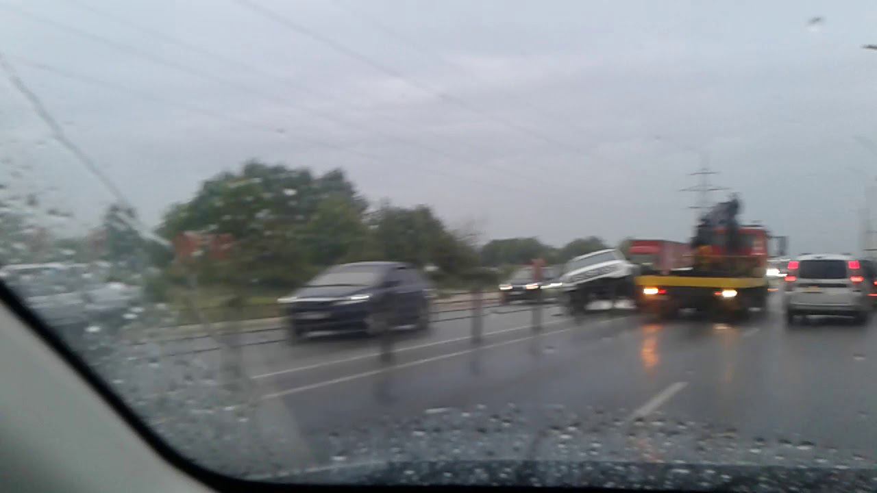 Машина повисла на троссовом ограждении, подъехал эвакуатор. Пробка около 5 км. Это было 8 июля 2019 вечером около 21 часа.