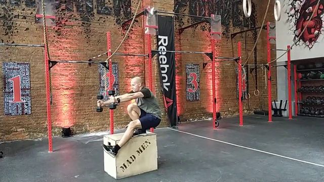 Приседания на одной ноге стоя на тумбе с гантелями в руках