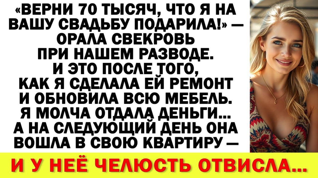 «Верни 70 тысяч, что я на вашу свадьбу подарила!» — орала свекровь при нашем разводе. И это после того, как я сделала ей ремонт и обновила всю мебель. Я молча отдала деньги… А на следующий день она вошла в свою квартиру — и у неё челюсть отвисла… Истории из жизни, Аудио рассказы , Аудиокниги, Аудиокниги слушать, Истории из жизни, реальные истории, жизненные истории, личные истории, интересные истории, удивительные истории, реальные истории, жизненные истории, личные истории, интересные истории, удивительные истории, жизненные истории слушать, реальные истории из жизни, слушать истории из жизни, Жизненные истории, Аудио рассказы слушать, бесплатные истории из жизни, интересные истории из жизни, истории из жизни людей, истории из жизни слушать бесплатно, Интересные рассказы, Слушать аудиокниги без регистрации #Историиизжизни #аудиокниги #аудиокнигислушать #аудиорассказ #интересныеистории #жизненныеисториислушать #жизненныеистории #жизненныеисториислушатьонлайн #интереснаяистория