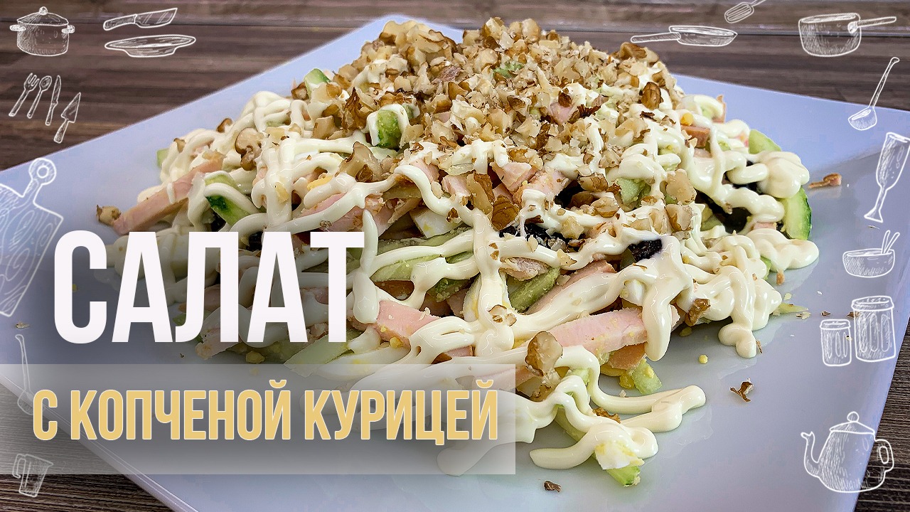 Салат с копченой курицей и грецкими орехами. Достойный праздничного стола. Рецепт салата: Огурцы свежие - 2 шт. Чернослив - 5 шт. Яйцо отварное - 2 шт. Курица копченая - 250 г. Орехи грецкие - 30 г. Майонез - 100 г. Приготовление: Курицу, яйца и огурец порезать соломкой. Чернослив измельчить. Перемешать все ингредиенты, сверху сделать майонезную сетку и посыпать измельчёнными орехами. Готово! Этот салат получается нереально вкусным и требует минимум времени, обязательно попробуйте приготовить.