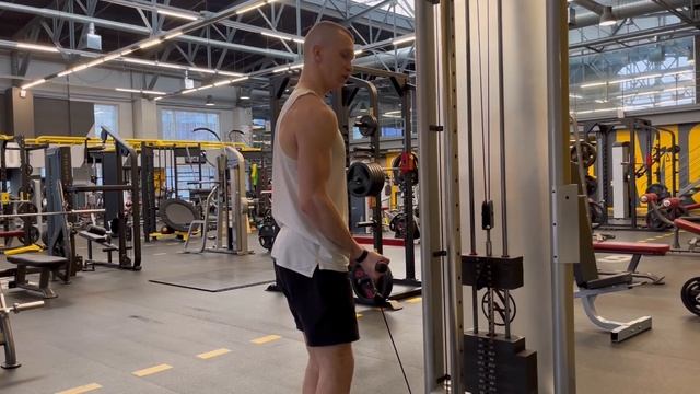 https://play.google.com/store/apps/details?id=com.nla.personalfitnesstrainer Техника выполнения: ⁃ Пользуемся широкой рукояткой; ⁃ Слегка сгибаем колени и отводим таз назад; ⁃ Прижимает локоть к корпусу и фиксируем в одном положении; ⁃ На выдохе выполняем сгибание руки, на вдохе - разгибание; ⁃ В нижней точке локоть до конца не разгибаем. Задействованные мышцы: ⁃ Бицепс. Ошибки при выполнении: ⁃ Беспорядочное движение плечом.