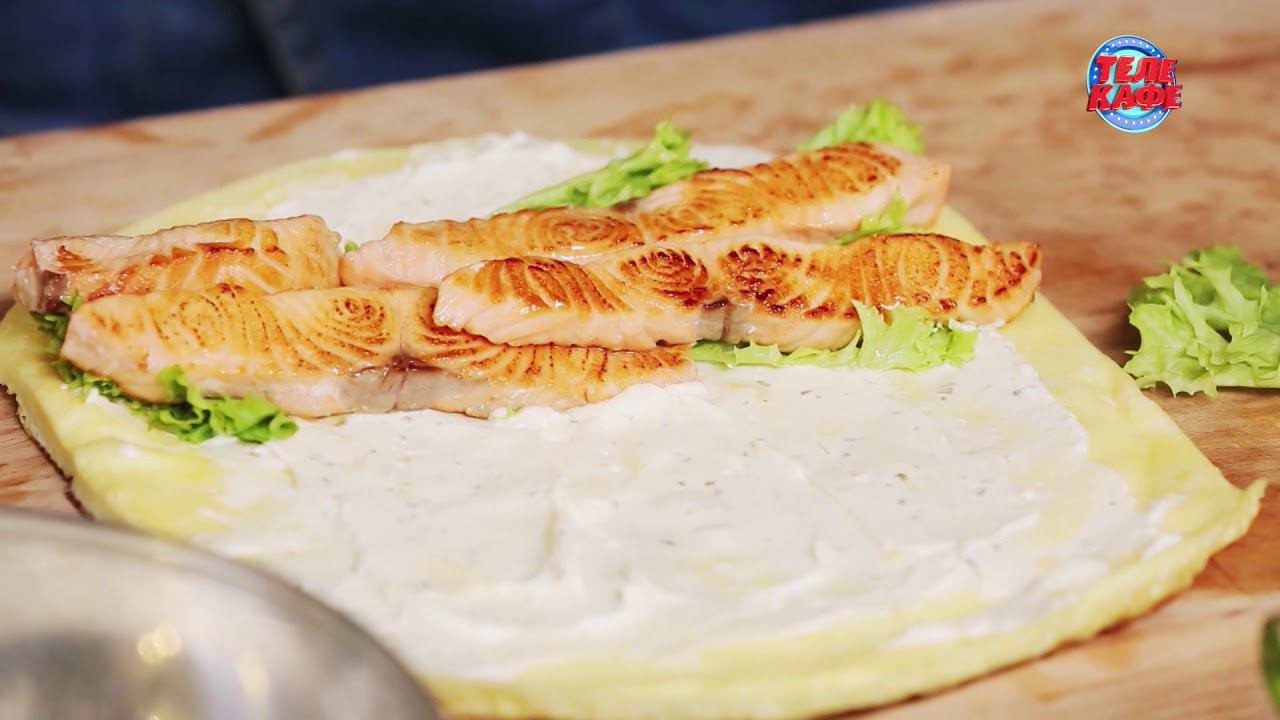 Детский завтрак. Ролл из омлета с лососем. Разноцветные блины