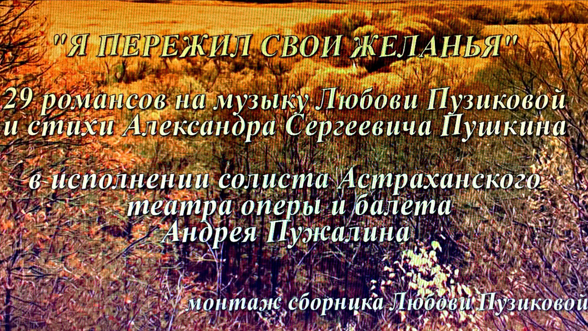 "Я ПЕРЕЖИЛ СВОИ ЖЕЛАНЬЯ" Сборник, 29 романсов на музыку Любови Пузиковой и стихи Александра Сергеевича Пушкина, в исполнении солиста Астраханского театра оперы и балета Андрея Пужалина. Монтаж сборника Любови Пузиковой.