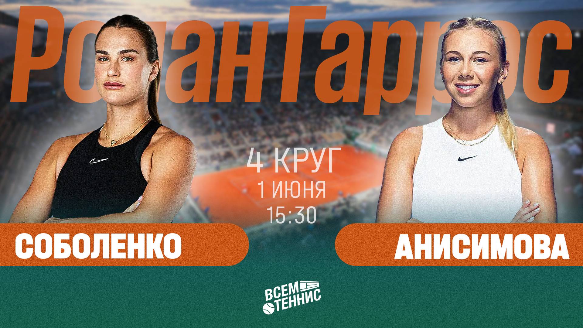 1.06.2025 | 15:30 | Соболенко - Анисимова | Ролан Гаррос | Прямая трансляция