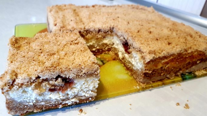 Рецепт: Крошка: 2 стакана муки рисовая и полбяная цельно зерновая (320 гр) 0.5 стакана сахара (120 гр) 125 гр сливочного масла меньше 0.5 чл соды Начинка: 2 пачки творога (360 гр) 3 яйца 0.5 стакана сахара (20 гр)