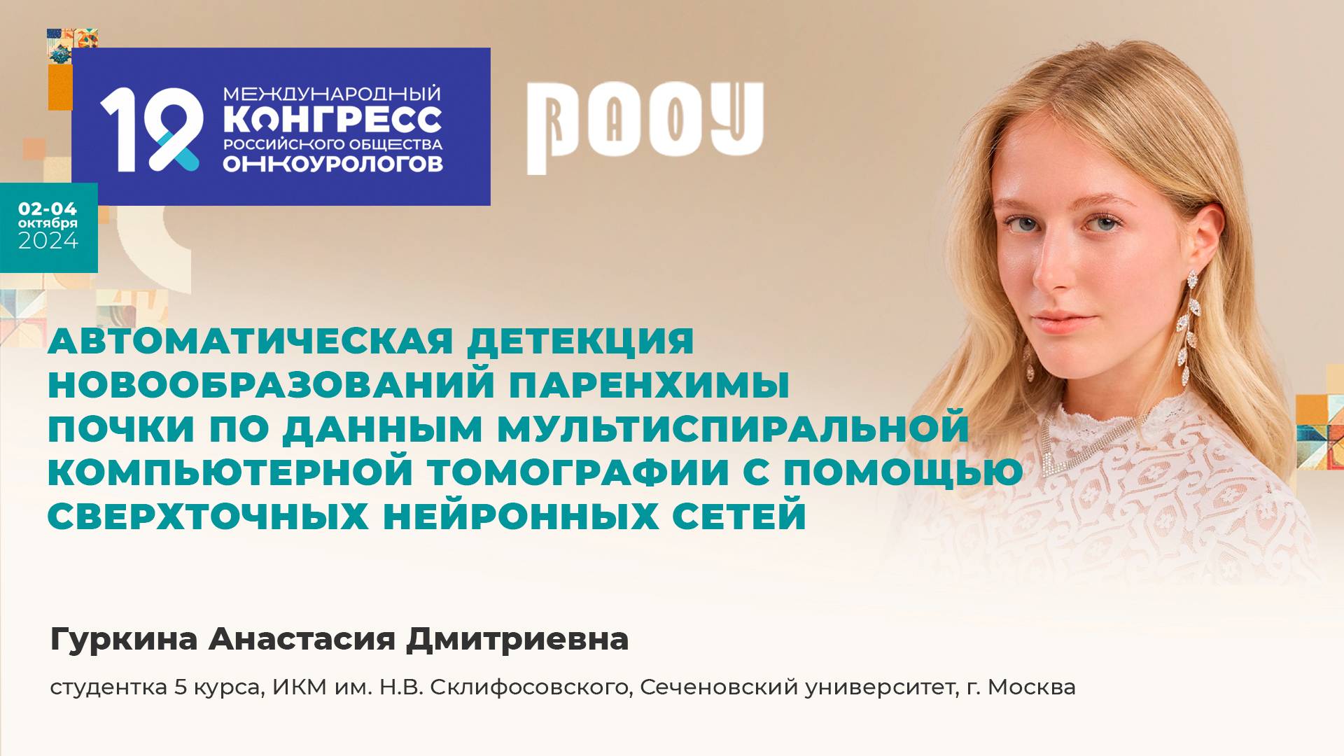 2 октября на XIX Международном Конгрессе РООУ, в рамках сессии Молодых учёных, Гуркина А. Д. представил доклад на тему: "Автоматическая детекция новообразований паренхимы почки по данным мультиспиральной компьютерной томографии с помощью сверхточных нейронных связей." ✅ Эксперт: Гуркина Анастасия Дмитриевна, с-тудентка s курса, ИКМ им. Н.В. Склифосовского, Сеченовский университет, г. Москва Соавторы: Сирота Е. С., Глыбочко П. В., Бутнару д. В., Алоев Ю. Г., Черненький М. М., Черненький И. М., Фиев Д. Н., Проскура А. В., Козлов В. В., Вовденко С. В., Жолдубаев А. А., Амрахов С. М., Исмаилов Х. М., Шурыгина Р. К., Измайлова А. А., Саркисьон И. П. ❗ ➡️ Официальный сайт РООУ: https://roou.ru/ Присоединяйтесь к нам в социальных сетях. Делитесь мнением и повышайте уровень теоретической и практической подготовки в онкоурологии: Telegram: https://t.me/oncologyurology ВКонтакте: https://vk.com/oncologyurology #РООУ #RAOU #ОбществоОнкоурологов #Онкоурология #Урология #Онкология #Oncourology #медицинскиеконференции #urology #OncologyUrology #Конгресс2024 #доктор #врачи #КонгрессРООУ #19КонгрессРООУ #XIXКонгрессРООУ
