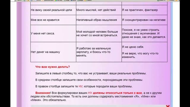 Множество людей работают с аффирмациями, пытаясь изменить себя. И не понимают, что нужно брать не просто красивые фразы, а сначала выявить свои Негативные убеждения (НУ), потом выстроить для каждого НУ свое Позитивное убеждение, и только потом пробовать загрузить его в себя. Иначе толку от аффирмаций (позитивных убеждений) практически не будет. Но никто не знает, как можно выявить свои Негативные убеждения, об этом никто не рассказывает. Практически поработать с прилагаемыми упражнениями по выявлению своих НУ можно на сайте www.selftras.ru
