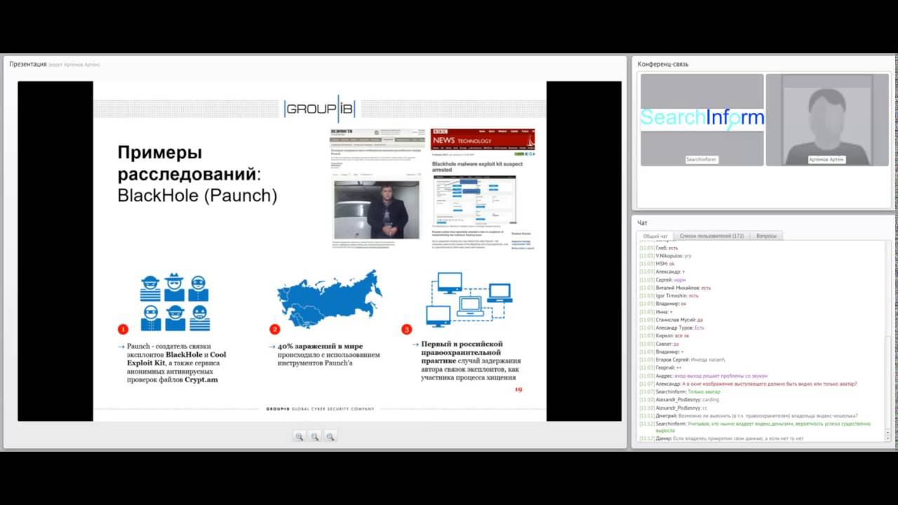 Совместный вебинар компаний SearchInform и Group-IB в рамках учебного курса "DLP от А до Я". Ведущие: Артём Артёмов, Ведущий специалист по компьютерной криминалистике, Group-IB. Алексей Дрозд, Директор учебного центра SearchInform. • Современные тенденции компьютерных преступлений. • Корпоративные расследования с применением систем слежения и мониторинга активности в сети организации (DLP, IDS/IPS, антивирусное ПО, SIEM-системы и т.д.). • Успешные расследования с участием компании Group-IB.Продукты и сервисы Group-IB по предотвращению компьютерных преступлений.