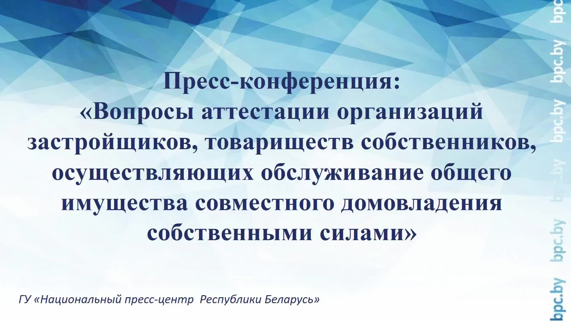 Пресс-конференция: «Вопросы аттестации организаций застройщиков, товариществ собственников, осуществляющих обслуживание общего имущества совместного домовладения собственными силами» Севрук Надежда Сергеевна – заместитель начальника управления жилищного хозяйства Министерства жилищно-коммунального хозяйства Республики Беларусь; Горбачева Екатерина Сергеевна – директор «Государственного учебного центра подготовки, повышения квалификации и переподготовки кадров «Жилком»; Жеймо Денис Сергеевич – директор РУП «Институт «Белжилпроект»; Драпей Ольга Александровна - заместитель генерального директора по идеологической работе ГО "Минское городское жилищное хозяйство" Задать вопрос: vopros@bpc.by Вся самая актуальная и оперативная информация о пресс-мероприятиях Национального пресс-центра Республики Беларусь будет публиковаться на нашем телеграм-канале. Подписывайтесь на нас: https://t.me/s/belpresscenter