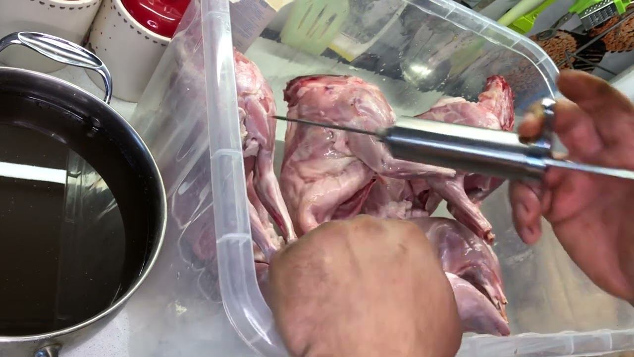 Друзья честно скажу раньше мариновать мясо приходилось или тузлук варить литрами чтобы погрузить полностью мясо или делать сухие посолочные смеси. Теперь мариную через шприц мясо всегда сочное нет ни пересола нет и недосола, всё в меру. Так что ссылочку оставлю на шприц- https://ya.cc/m/Q76Pdc1?erid=25H8d7vbP94SaZjPpqeyji Кролики на 6,4 кг все трое воды 2,5 литра соль 80 грамм на литр, перец чёрны, перец душистый чеснок сушёный проварил 5 минут остудил ииии да самой кости промариновал, теперь буду сушить и коптить , не пропустите. Мой Дзен - https://dzen.ru/med_vam?share_to=link