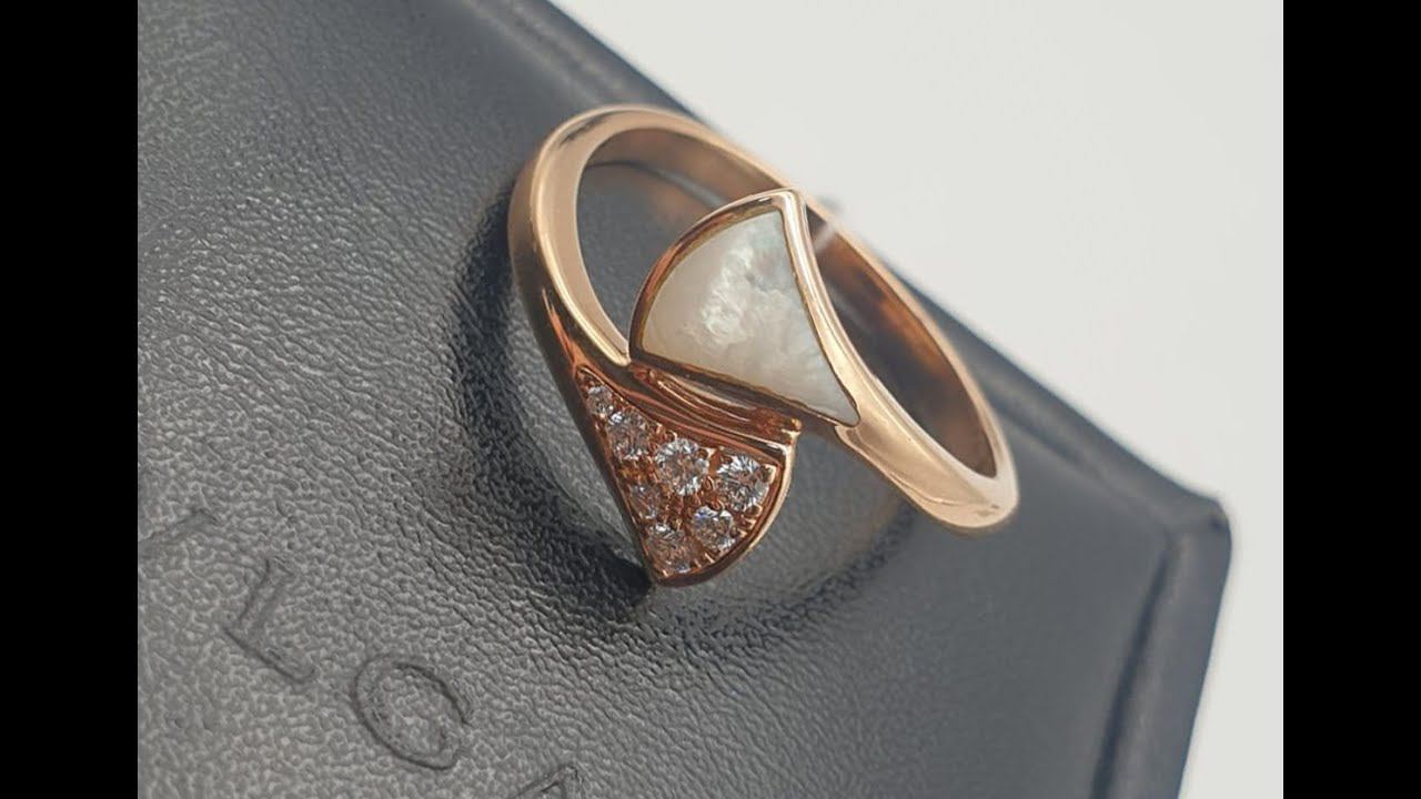 Кольцо Bvlgari Divas' Dream в форме веера выполнено из розового золота 750-й пробы, украшено бриллиантами общим весом 0,1 карата и перламутром.