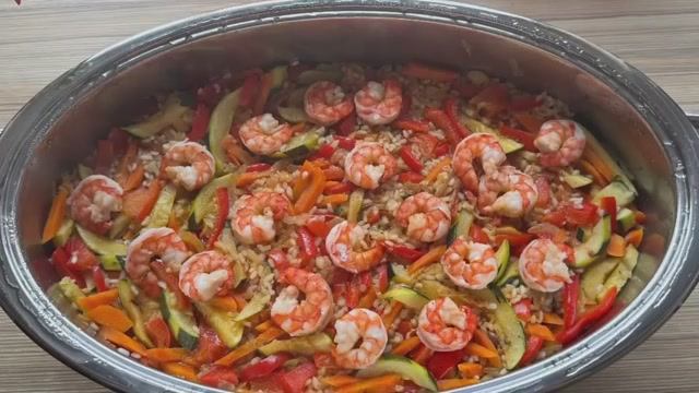 Овощи с рисом и креветками под крышкой пароваркой.