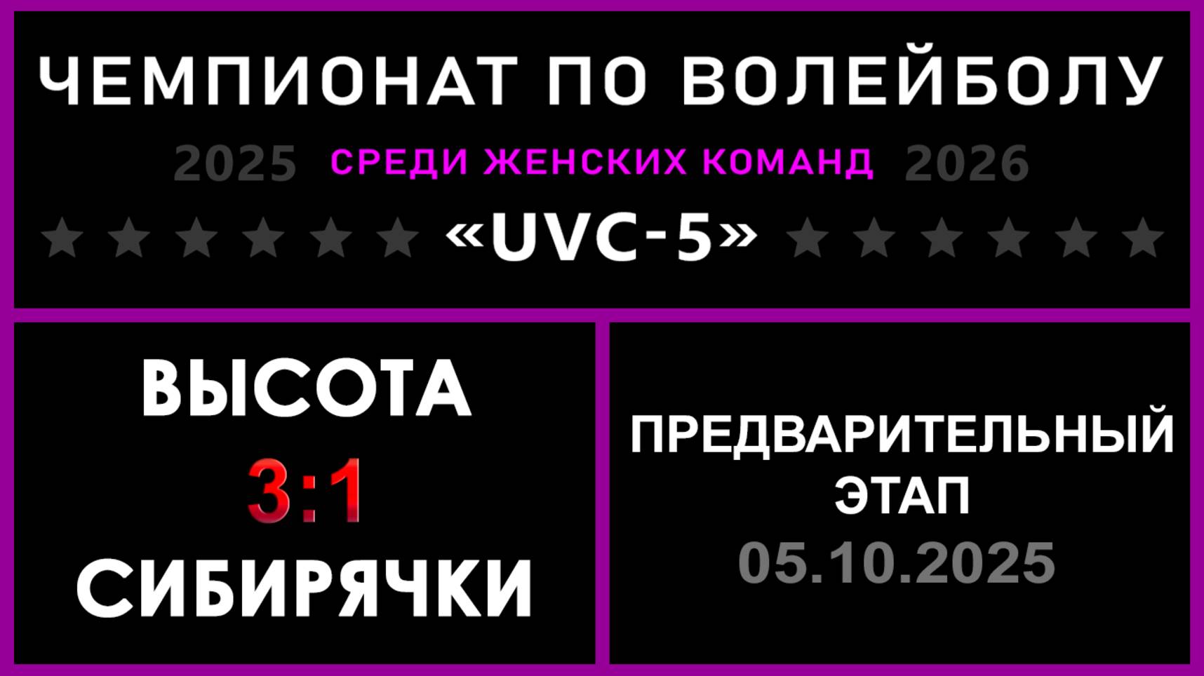 UVC-5 (Девушки): Чемпионат UVC Лиги по волейболу среди женских команд 2025-2026 гг. Результаты игры: Предварительный этап 05.10.2025 Высота - Сибирячки 3:1 (25:15, 20:25, 25:18, 25:15) Очень интересное противостояние, Галимова против Зюзиковой, остальные игроки активно помогали своим лидерам! Высота сегодня была посильнее, но Сибирячки смотрелись достойно! ✅Обе команды прошли в следующий этап конкурса «РЕШАЛЫ»! ✅ Точный исход матча угадали 18 участников «Nostradamus trophy»! #UVC_ЛИГА_ЧЕМПИОНАТ_UVC_5_Девушки