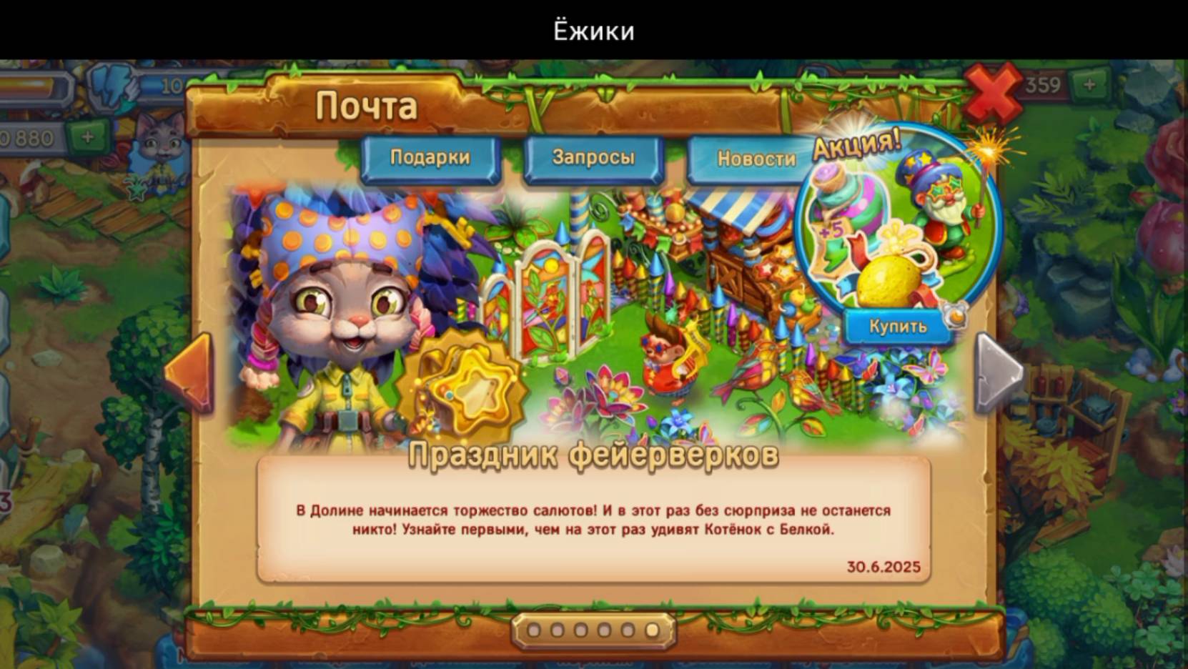Ёжик обменивается с Енотом, а потом отправляется в Праздничную долину вместе с Котёнком отмечать торжество салютов - Котёнок обещает сюрприз. Ёжик смотрит новый декор в магазине (00:46). Потом смотрит Фейерверковый набор (01:46) - празднующий гном, 50 искрящихся лимонов, 10 праздничных жетонов и 2 праздничных зелья выносливости. А потом начинает понемногу разгонять туман в праздничной долине и находит огромное дерево с ключами (теперь ключи собираются не по времени, а фейерверками). Ёжик просматривает призы в сундуках и призы за уровни фестиваля (03:31), открывает первый сундук, находит и чинит фабрику фейерверков, делает маленькие ракеты и сбивает нижние ключи, находит первый портал, чинит первый портал, находит праздничный магазин, чинит праздничный магазин, сажает хризантемы, находит Белку и Мастерскую Белки, делает защитные рукавицы и собирает красящий сорняк, делает праздничные кирпичи и находит второй портал. Чинит второй портал, находит грядку и находит заросшее рыбное место.