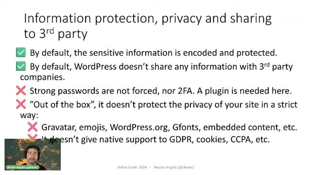 The Trial of developers and web designers against WordPress begins. Silence in the room! A human-made piece of software cannot be perfect by definition. Depending on your case or your tolerance, you can consider that something more than 90% certainty is what we consider "safe"... or not. Security in WordPress, like everything in real life, is made up of layers, and it will be how you organize those layers, depending on your needs, that will make your WordPress site more or less secure. With the aesthetic of an American courtroom movie, we will try to give a verdict on whether or not WordPress is secure, explaining what security is, what WordPress does about it, and what we should do by ourselves to increase the level of security of our sites. Nestor Angulo is a Technology enthusiast, Computer Science Engineer, and web security geek. He also loves to travel! Although based in Spain, you can find him learning from other cultures and meeting people where an Internet connection is available, always with a mug of coffee or black tea. Nestor worked in the Incident Response department at Sucuri and at GoDaddy WebSecurity from 2015 through 2023, and it is there where he acquired tons of knowledge about hackers, malware, and strange cases which he liked to study in depth, just as a CSI (AKA Security Analyst). Now, he’s continuing his journey for a more secure world with the amazing team of Patchstack. This presentation was a part of the Stellar Spark Conference held July 19, 2024. To learn more about StellarWP and our brands, visit us at https://stellarwp.com/.