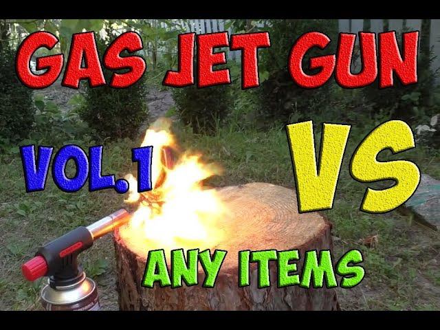 Awesome experiment - gas jet gun VS water, syrup, gas cylinder, lamp, shaving foam and oil can