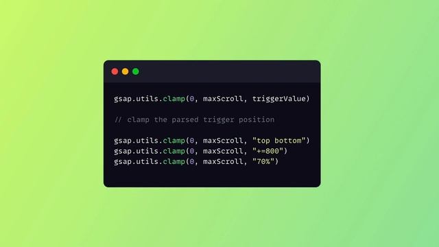 Getting your trigger points set up in exactly the right place is hard, and it can be annoying when scrubbed ScrollTriggers are part-way through on page load. In v3.12 we've extended a helping hand. Now you can clamp your trigger values between the min and max scroll positions. Not sure why you would need to do that? Well, let's take a look together... ---- demos ---- ScrollTrigger - https://codepen.io/GreenSock/pen/oNadjoa ScrollSmoother - https://codepen.io/GreenSock/pen/gOBedNX Final demo - https://codepen.io/GreenSock/pen/JjmLLWZ ---- docs ---- https://greensock.com/docs/v3/Plugins/ScrollTrigger
