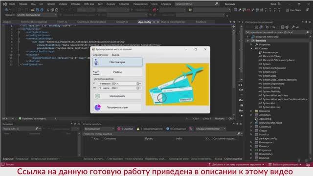 https://kursovik.com/programming/101450434.html Автоматизированная информационная система «Авиабилеты» (бронирование мест на самолёт). Курсовая работа. Среда разработки: Visual Studio. Технология разработки: WindowForms. Среда программирования: Visual C# .NET 2019. База данных: MS SQL Server 2019. Программа "Авиабилеты" предоставляет пользователю возможность управлять бронированием мест на самолеты. После запуска приложения открывается главная форма, через которую можно получить доступ ко всем функциям программы. Первоначально необходимо заполнить справочные данные. Справочник "Страны" содержит список стран, где располагаются аэропорты. Справочник "Аэропорты" позволяет поддерживать актуальный список аэропортов, доступных для рейсов. Выбор аэропорта осуществляется через выпадающий список, где указывается соответствующая страна. Справочник "Самолеты" содержит информацию о доступных для рейсов самолетах. Форма "Пассажиры" позволяет просматривать список пассажиров с указанием их даты рождения и контактного номера телефона. Также предусмотрена возможность поиска пассажиров по ФИО или номеру телефона. Форма "Маршруты" выводит данные о доступных рейсах. Обработка информации о рейсах осуществляется с помощью дополнительной формы. Для каждого маршрута можно зарегистрировать билеты с указанием багажа для каждого пассажира рейса. Программа также предоставляет возможность формирования итоговых данных для анализа. Отчет "Статистика рейсов" отображает информацию о количестве пассажиров на рейсе и общем весе багажа. Диаграмма "Популярность стран" отображает наиболее популярные страны, в которые выполняются маршруты. Приобрести исходники(все файлы проекта) данной программы Вы можете, заполнив следующую форму: https://kursovik.com/programming/101450434.html?camefrom=rutube#form Заказать отчёт(описание): https://kursovik.com/programming/101450434.html?camefrom=rutube#pz_need Заказать модификацию: https://kursovik.com/uniform.html?modify=101450434&camefrom=rutube Заказать новую программу: https://kursovik.com/programming_order.html?camefrom=rutube Задать вопрос автору: https://kursovik.com/programming/101450434.html?camefrom=rutube#vopros Видеоинструкция по созданию, подключению и настройке базы данных в MS SQL Server: https://rutube.ru/video/7a19c2a27f7292bc8bd04556eab969b3/?playlist=753123 Наш Телеграм-БОТ для поиска готовых работ по программированию https://t.me/kursovikcom_bot , в нашей базе более 5и тысяч готовых работ, для более эффективного поиска используйте наш Телеграм-БОТ. Список наших готовых работ по программированию: https://kursovik.com/progtopic.html?camefrom=rutube Разработка программ на заказ согласно Вашему заданию: https://kursovik.com/programming_order.html?camefrom=rutube Мы пишем программы практически на всех языках программирования, работаем с различными базами данных, выполняем как мелкие задачки, так и крупные проекты. Разрабатываем и запускаем в работу ЧАТ-БОТы. Обращайтесь - всегда будем рады Вам помочь! Если нужно переписать данную программу на другой язык программирования - обращайтесь - сделаем. Адрес нашего сайта: https://kursovik.com Наши контакты: https://kursovik.com/contacts.html Наша группа ВК: https://vk.com/kursovik (всем подписчикам скидка 5%) Наш Телеграм-канал: https://t.me/kursovik (всем подписчикам скидка 5%) Наш Дзен-канал: https://dzen.ru/kursovik (всем подписчикам скидка 5%) Наш RuTube-канал: https://rutube.ru/channel/41864889 (всем подписчикам скидка 5%) Наш YouTube-канал: https://youtube.com/@kursovik_com (всем подписчикам скидка 5%) (скидки не суммируются :-) #курсоваяработа #базыданных #visualstudio #программирование