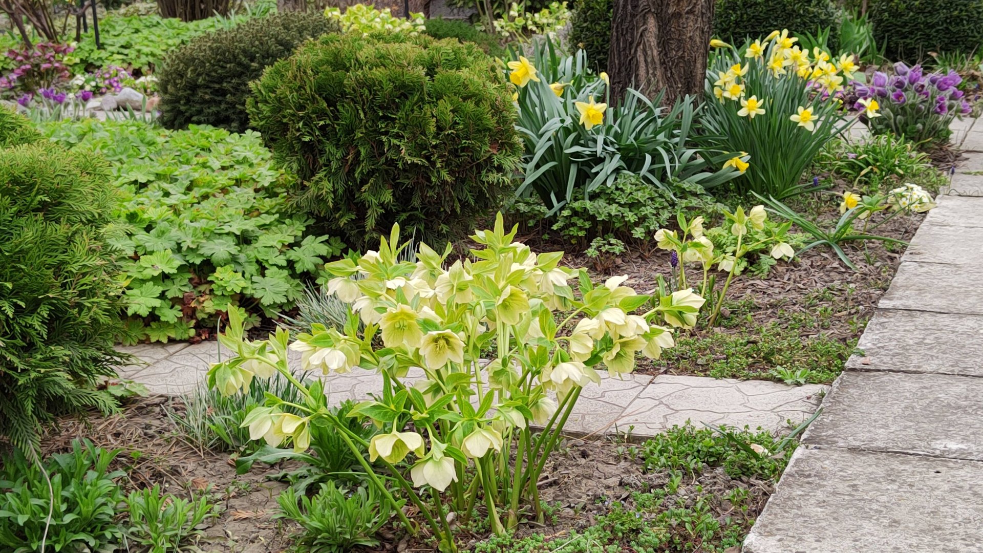 Распустилась форзиция, морозник в дизайне сада. 05.04.2024 г. Пятигорск, зона 6б-7а.