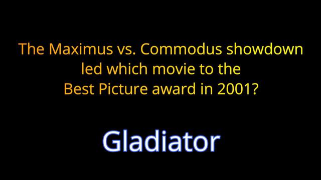 1985-2020 Academy Award Best Picture Winners 20 General Knowledge Questions EPISODE 139 20 Questions / 10 Minutes ---------------------------------- The Academy Awards, more popularly known as the Oscars, are awards for artistic and technical merit in the film industry. Given annually by the Academy of Motion Picture Arts and Sciences (AMPAS), the awards are an international recognition of excellence in cinematic achievements as assessed by the Academy's voting membership. The various category winners are awarded a copy of a golden statuette, officially called the "Academy Award of Merit", although more commonly referred to by its nickname, the "Oscar". The statuette depicts a knight rendered in the Art Deco style. The award was originally sculpted by George Stanley from a design sketch by Cedric Gibbons. AMPAS first presented it in 1929 at a private dinner hosted by Douglas Fairbanks in the Hollywood Roosevelt Hotel in what would become known as the 1st Academy Awards. The Academy Awards ceremony was first broadcast by radio in 1930 and was televised for the first time in 1953. It is the oldest worldwide entertainment awards ceremony and is now televised live worldwide. It is also the oldest of the four major annual American entertainment awards; its other three equivalents – the Emmy Awards for television, the Tony Awards for theater, and the Grammy Awards for music – are modeled after the Academy Awards. It is widely cited as the most famous and prestigious competitive award in the field of entertainment. The year is the date of the award ceremony. The movie typically came out the year before: 2020 - "Parasite 2019 – "Green Book" 2018 - "The Shape of Water" 2017 - "Moonlight" 2016 - "Spotlight" 2015 - "Birdman" 2014 - "12 Years a Slave" 2013 - "Argo" 2012 - "The Artist" 2011 - "The King's Speech" 2010 - "The Hurt Locker" 2009 - "Slumdog Millionaire" 2008 - "No Country for Old Men" 2007 - "The Departed" 2006 - "Crash" 2005 - "Million Dollar Baby" 2004 - "The Lord of the Rings: The Return of the King" 2003 - "Chicago" 2002 - "A Beautiful Mind" 2001 - "Gladiator" 2000 - "American Beauty" 1999 - "Shakespeare in Love" 1998 - "Titanic" 1997 - "The English Patient" 1996 - "Braveheart" 1995 - "Forrest Gump" 1994 - "Schindler’s List" 1993 - "Unforgiven" 1992 - "The Silence of the Lambs" 1991 - "Dances With Wolves" 1990 - "Driving Miss Daisy" 1989 - "Rain Man" 1988 - "The Last Emperor" 1987 - "Platoon" 1986 - "Out of Africa" 1985 - "Amadeus" 1984 - "Terms of Endearment" 1983 - "Gandhi" 1982 - "Chariots of Fire" 1981 - "Ordinary People" 1980 - "Kramer vs. Kramer" 1979 - "The Deer Hunter" 1978 - "Annie Hall" 1977 - "Rocky" 1976 - "One Flew over the Cuckoo's Nest" 1975 - "The Godfather Part II" 1974 - "The Sting" 1973 - "The Godfather" 1972 - "The French Connection" 1971 - "Patton" 1970 - "Midnight Cowboy" 1969 - "Oliver!" 1968 - "In the Heat of the Night" 1967 - "A Man for All Seasons" 1966 - "The Sound of Music" 1965 - "My Fair Lady" 1964 - "Tom Jones" 1963 - "Lawrence of Arabia" 1962 - "West Side Story" 1961 - "The Apartment" 1960 - "Ben-Hur" 1959 - "Gigi" 1958 - "The Bridge on the River Kwai" 1957 - "Around the World in 80 Days" 1956 - "Marty" 1955 - "On the Waterfront" 1954 - "From Here to Eternity" 1953 – "The Greatest Show on Earth" 1952 - "An American in Paris" 1951 - "All About Eve" 1950 - "All the Kings Men" 1949 - "Hamlet" 1948 - "Gentleman's Agreement" 1947 - "The Best Years of Our Lives" 1946 - "The Lost Weekend" 1945 - "Going My Way" 1944 - "Casablanca" 1943 - "Mrs. Miniver" 1942 - "How Green Was My Valley" 1941 - "Rebecca" 1940 - "Gone with the Wind" 1939 - "You Can't Take It with You" 1938 - "The Life of Emile Zola" 1937 - "The Great Ziegfeld" 1936 - "Mutiny on the Bounty" 1935 - "It Happened One Night" 1933/1934 - "Cavalcade" 1932/1933 - "Grand Hotel" 1931/1932 - "Cimarron" 1930/1931 - "All Quiet on the Western Front" 1929/1930 - "The Broadway Melody" 1928/1929 - "Wings" ---------------------------------- 1985-2020 - BEST PICTURE WINNERS - trivia - 20 Questions about the Oscars {ROAD TRIpVIA- ep:139] This quiz is brought to you by Road TRIpVIA. The YouTube based trivia game that you can play while driving in your car. You have about 7 seconds after the question is read to answer it. The question is read out loud first (before it shows up on the screen) so that the driver of the vehicle has the same opportunity to shout out the answer as the passengers (who are able to watch the screen). The quizzes are usually 20 questions each and you keep track of the score. It's a great game to play with a car full of friends, or to just play by yourself while driving. I find it's especially great to help keep you awake on the long hauls. Whether you're a fan of general trivia, trivia questions, fast paced trivia, jeopardy, or other quiz type games... this channel is for you! The quiz has 20 questions.