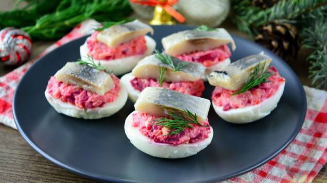 Готовится закуска очень просто, ведь ничего слоями выкладывать не нужно. Отварной картофель, свёкла и морковь натираются на тёрке и соединяются с варёными измельчёнными желтками и майонезом. Затем этой массой наполняются половинки яиц, а сверху выкладывается кусочек ароматной селёдочки. #ЯйцаФаршированные #ЗакускиПраздничные #ЗакускиНовогодние #ЯйцаСНачинкой #СелёдкаПодШубой