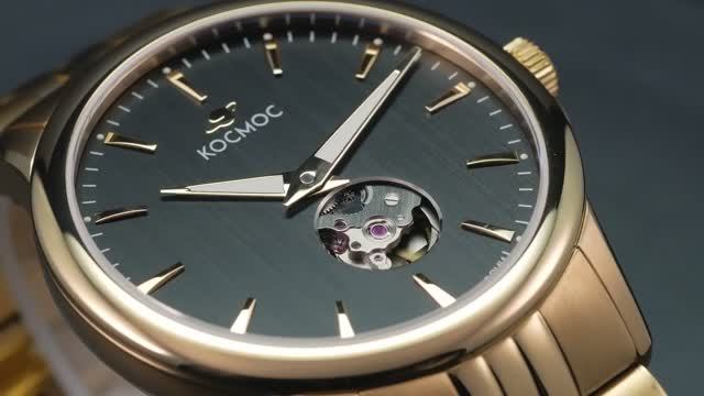 Апертура открытого баланса модели по форме напоминает круглую линзу телескопа. Сквозь это окошко, расположенное на черном циферблате, также можно увидеть много интересного: ту самую систему «баланс-спираль» автоматического механизма, которая отвечает за точность хода. Часы Телескоп установлены в классический круглый корпус из нержавеющей стали с PVD-покрытием из желтого золота. Для механических часов он достаточно тонкий. Все дело в установленном внутри механизме Miyota, калибр 9029, высота которого всего 3.9 мм. Дизайн циферблата отсылает нас к стилю ретро: на него нанесена текстура в виде вертикальных полос. На этом фоне движутся крупные часовая и минутная стрелки, выделенные люминесцентным покрытием, которое светится в темноте. В часах установлено сапфировое стекло с антибликовым покрытием. Обратите внимание на заднюю крышку. В серии Телескоп она прозрачная и крепится на 4-х винтах, здесь выгравирован индивидуальный номер часов в формате хх/50. Цифра 50 обозначает, что тираж каждой модели составляет всего 50 штук. Браслет часов сделан из нержавеющей стали с удобной и надежной застежкой-клипсой. https://cosmos-watches.ru/catalog/watch/60497/