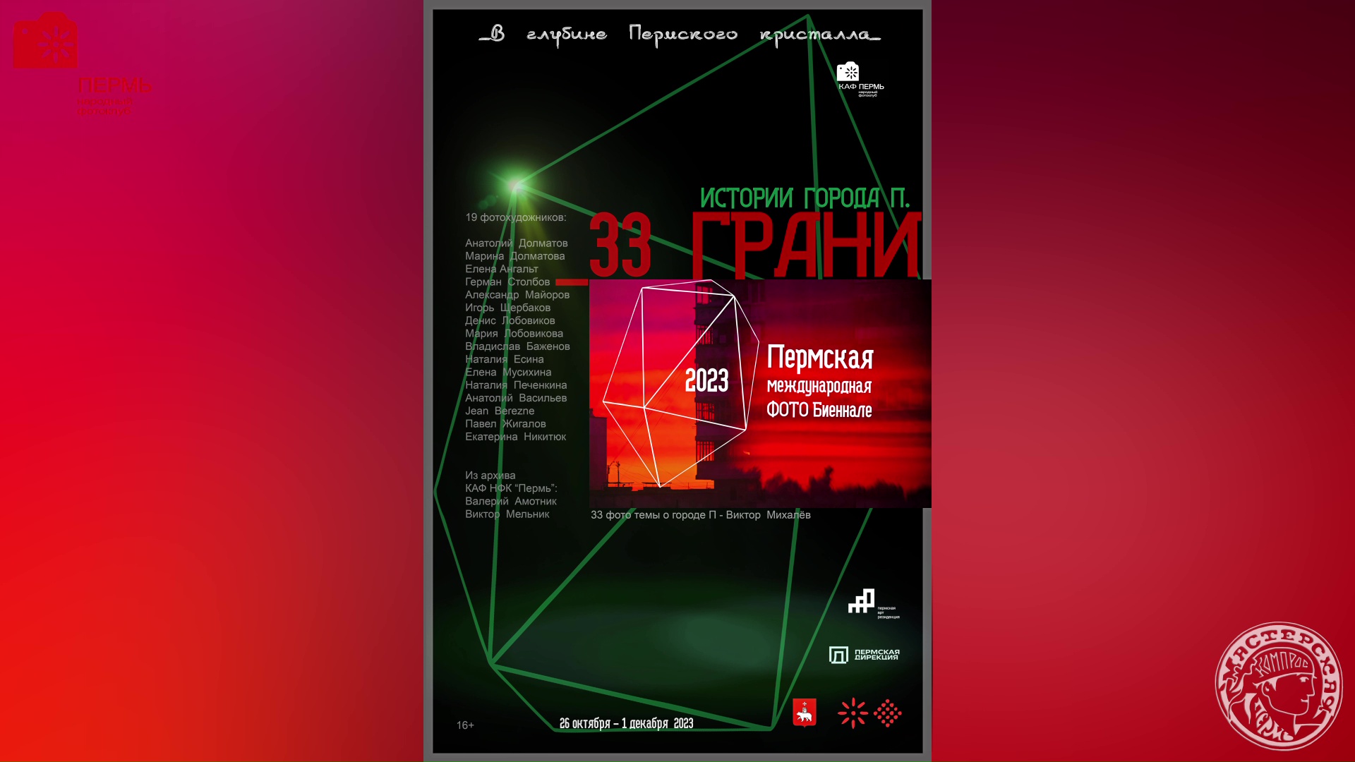 #Пермь #ВглубинеПермскогокристалла #Пермь300 #80летПДНТ #выставка #ПДНТГуберния #ПДНТ #краеваяассоцияцияфотохудожников #нфкПермь #видеомонтажназаказ #слайдшоуназаказ #народныйфотоклубПермь #фотобиеннале Краевая ассоциация фотохудожников Народный фотоклуб «Пермь» ПДНТ «Губерния26 октября 2023 года открывает две первых выставки проекта Пермская Международная Фото Биеннале-2023 г. «В глубине Пермского кристалла» I часть Пермской Международной Биеннале-2023 «В глубине Пермского кристалла»: 1. Персональная выставка Юрия Чернова «В сторону Дягилева». Юрий Чернов – известный пермский театральный фотограф, член Союза театральных деятелей, много лет служивший в Пермском академическом театре оперы и балета им. П.И. Чайковского, работающий более 20 лет в дирекциях Дягилевского фестиваля и Международного конкурса молодых артистов балета «Арабеск». Снимки, сделанные во время спектаклей и передающие лёгкость танца и изящество движения, поймавшие самую высшую точку полёта примы, отточенность па – результат не только огромного театрального опыта фотографа, но его знание театра, любовь к нему, понимание природы сценического существования артиста балета. Фотографии передают динамику движения, грациозность поз, и в то же время позволяют разглядеть подчас не видимые посетителю зрительного зала театра мельчайшие детали. В представленных работах нет постановочных кадров, каждый кадр – часть сложной ткани спектакля, звучащая музыка движения. Арт-резиденция, Большой красный зал, 1 этаж., категория «0+». 2. «33 грани Пермского кристалла. Истории города П.» 19 авторов, 111 фотографий. 33 грани Пермского кристалла. Истории города П. Эта фотоистория будет интересна в нравственном, филосовском смыслах, в переосмыслении ценностей. Фоторяд сопровождается короткими названиями-определениями «граней» кристалла, название которому Пермь. В городе Пермь живут люди, точно такие же, как и в других городах нашей страны. Они испытывают те же чувства, сталкиваются с такими же проблемами, решают сложные задачи и выходят из трудных жизненных ситуаций. Это рассказ о самых разных жителях этого города, об их внутреннем мире, делах, заботах, и конечно же, о самом городе. Возможно кто-то в героях этого фоторассказа узнает себя, задумается о своём образе жизни, привычках, желаниях, возможностях, страхах, а также переосмыслит восприятие некоторых вещей и сделает какие-то выводы. Грани заявлены такие: 1.О смекалке 2. Об ограничениях 3. Об одиночестве 4.О мечтах 5. О разрухе 6. Об истории 7. О мыслях 8. Об отчуждённости 9. О воспоминаниях 10. О характере 11. Об эмоциях 12. О доблести 13. О привычках 14. О товарищах 15. Об образах 16. О поиске 17. О взглядах 18. О нужде 19. Об усердии 20. О страхах 21. О преданности 22. О друзьях 23. О наставниках 24. О нравах 25. О возможностях 26. О состоянии 27. О вере 28. О высоком 29. О творчестве 30. О различиях 31. О взлётах и падениях 32.О насущном 33. О юности 19 авторов создали коллекции фотографий для каждой грани из своих предствлений и образного восприятия. Автор идеи об историях города П. – Виктор Михалёв Куратор Международной Пермской Биеннале-2023 «В глубине Пермского кристалла» - Елена Щербакова-Ангальт Арт-резиденция, Большой серый зал, 2 этаж, категория «16+». Время экспозиции двух выствок Пермской Международной Биеннале-2023: с 27 октября по 1 декабря 2023 г., Пермская Арт-резиденция. Откр