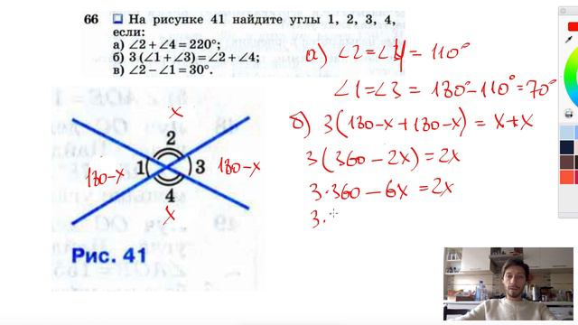 №66. На рисунке 41 найдите углы 1, 2, 3, 4, если: a) ∠2 +∠4 = 220°; б) 3(∠1 +∠3) = ∠2 +∠4; в) ∠2-∠1 = 30°. Сайт - https://taplink.cc/esumin Группа VK - https://vk.com/sumin55 Телеграм - https://t.me/geometry0 Dzen - https://dzen.ru/sumin1 Rutube - https://rutube.ru/channel/25395774/ VK - https://vk.com/evgeniysumin Геометрия с нуля - https://www.youtube.com/ГЕОМЕТРИЯСНУЛЯ Канал для подготовки к ЕГЭ и ОГЭ - https://www.youtube.com/ЕвгенийСумин TikTok - https://vm.tiktok.com/WJJwK9