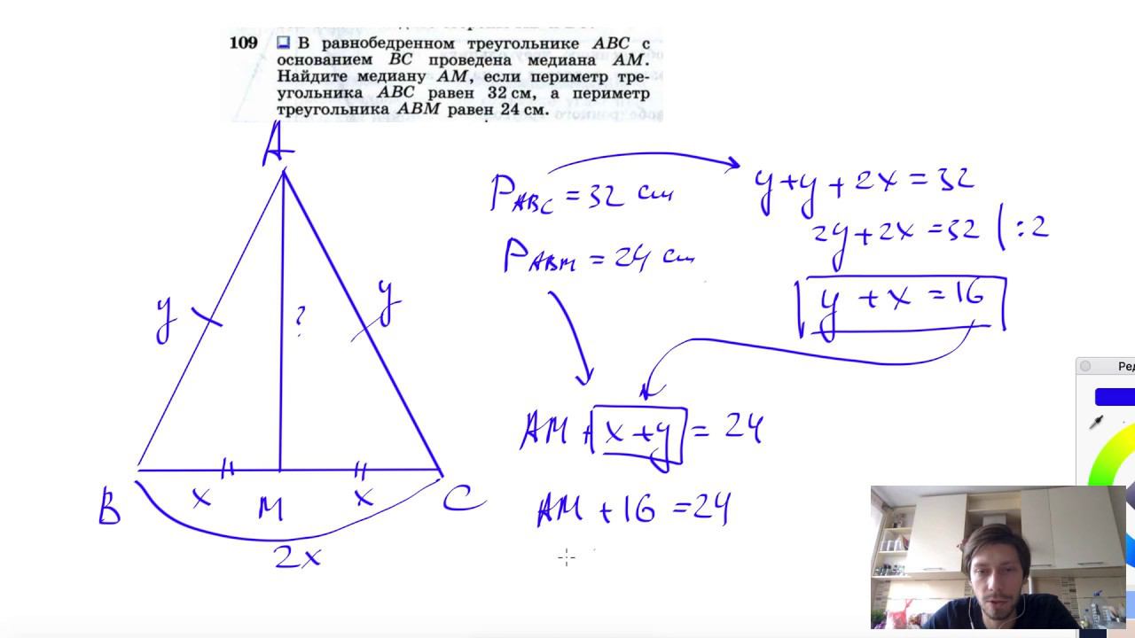 №109. В равнобедренном треугольнике ABC с основанием ВС проведена медиана AM. Найдите медиану AM, если периметр треугольника ABC равен 32 см, а периметр треугольника АВМ равен 24 см. Поддержать канал рублём - 5469400944002125 (Сбербанк) Мой второй канал для подготовки к ЕГЭ и ОГЭ - https://www.youtube.com/ЕвгенийСумин Инстаграм - https://www.instagram.com/EGE_OGE.math Личный инстаграм - https://www.instagram.com/ee_sumin VK - https://vk.com/evgeniysumin FB - https://www.facebook.com/EvgeniySumin
