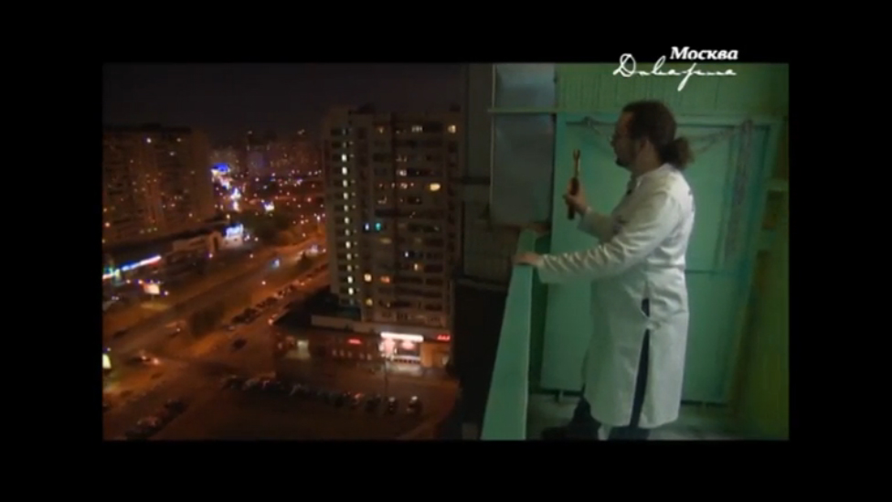 Независимый эксперт лаборатории ТестЭко - Александр Кукса измеряет люксометром освещённость от рекламных щитов в квартире напротив.