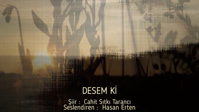 DESEM Kİ Desem ki vakitlerden bir Nisan akşamıdır, Rüzgârların en ferahlatıcısı senden esiyor, Sende seyrediyorum denizlerin en mavisini, Ormanların en kuytusunu sende gezmekteyim, Senden kopardım çiçeklerin en solmazını, Toprakların en bereketlisini sende sürdüm, Sende tattım yemişlerin cümlesini. Desem ki sen benim için, Hava kadar lazım, Ekmek kadar mübarek, Su gibi aziz bir şeysin; Nimettensin, nimettensin! Desem ki... İnan bana sevgilim inan, Evimde şenliksin, bahçemde bahar; Ve soframda en eski şarap. Ben sende yaşıyorum, Sen bende hüküm sürmektesin. Bırak ben söyleyeyim güzelliğini, Rüzgârlarla, nehirlerle, kuşlarla beraber. Günlerden sonra bir gün, Şayet sesimi farkedemezsen, Rüzgârların, nehirlerin, kuşların sesinden, Bil ki ölmüşüm. Fakat yine üzülme, müsterih ol; Kabirde böceklere ezberletirim güzelliğini, Ve neden sonra Tekrar duyduğun gün sesimi gökkubbede, Hatırla ki mahşer günüdür Ortalığa düşmüşüm seni arıyorum. Cahit Sıtkı TARANCI Seslendiren: Hasan Erten