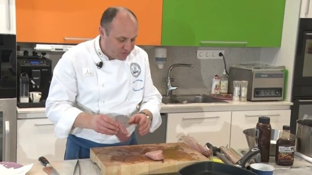 4. Жарка после «су-вид». КазБиф. Топ-блэйд (филе лопатки), глазной мускул, межреберные стрипсы / Мастер-класс шеф-повара Ильи Лазерсона / Обработка и приготовление мяса / Американская кухня / Кухня США / Жареные мясные блюда / Отбивные и стейки / 4. Жарка СТЕЙКОВ после «СУ-ВИД» . Топ-блэйд, глазной мускул, межреберные стрипсы: - Жарка мраморной говядины КазБиф, подготовленной по технологии «су-вид». - Что делать с мясным соком. - Создание глазури на мясе. - Оценка вкуса и мягкости. • 00:00: И так, мы работаем с подваренным мясом. Это ребра – 2 часа 55 градусов С. • Это подваренный top blade (лопаточная мышца) - 2 часа. • И вот это глазной мускул. • • Ребра при таком подваривании – мягком, выделилось немного сока, но • 00:31: процент отходов, между прочим, процент потерь при тепловой обработке будет очень низким, поэтому подваривание всегда еще снижает потери, а следовательно, снижает себестоимость. • • Ну вот я сейчас просто выкладываю на гриль. • Это мясо сравнительно жирное, масло здесь вообще не надо, вот так по порциям можно подваривать и работать, а вот этот сочок идет в Демиглас. • 01:03: Этот сочок – ценнейший, надо собирать и добавлять в демиглас, который варится у тебя круглые сутки. Это очень ценное сырье. • • Сейчас идет процесс жарки ребер, межрёберного мяса, говяжьего. Какой приятный более светлый цвет стал у мяса. • У меня стоит наготове острая мексиканская глазурь или тот же соус • 01:35: барбекью, потому что соусы вот такого густого типа могут использоваться, как глазурь для смазывания мяса во время жарки, поэтому у меня сейчас лежит кисточка. Когда образуются корочка, я начну с ней работать. • Межрёберное мясо я сейчас перевернул, и • 02:14: вот уже эту часть могу смазать глазурью. Я лучше этой острой смажу. • Я могу дать немного глазури прямо на ребра и размазать кисточкой. С одной стороны они смазаны сейчас глазурью, потому что глазурь долго нагревать не • 02:50: надо. Я переверну их, да, но они уже недолго готовятся с той стороны, где глазурь, чтобы она не сильно горела. Они сейчас прихватятся с другой стороны. Прижимать тоже не надо, все должно быть естественно. • 03:20: Еще немного противоположная сторона будет смазала глазурью, а теперь уже можно, допустим, вот так их попереворачивать, чтобы равномернее прожаривались. От глазури ребрышки блестят, как всякое другое мясо. • И даже мы здесь, конечно, можем • 04:25: регулировать степень прожарки рёбер, потому что температура стандартна, но во время варки мы можем регулировать степень готовности рёбер внутри: от сыроватых до уже Well done (хорошо прожаренное). • • И уже можно их подавать. Все на них есть • 04:55: корочка, они могут быть поданы. Споласкиваю грильную сковородку. • Теперь мы поджарим одновременно два стейка. Кровья я сливаю. Повторяю, это ценный продукт для из