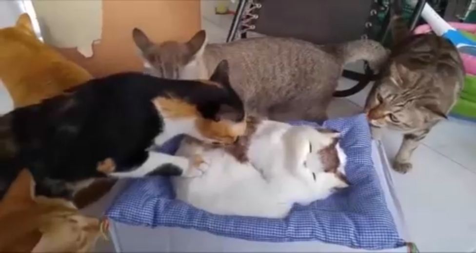 Знакомство котов с игрушечной киской