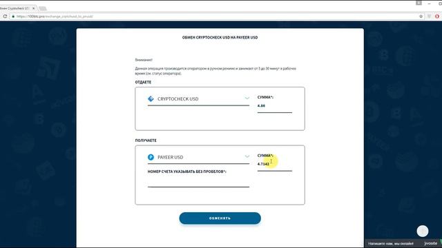 Как обменять Cryptocheck на Payeer по выгодному курсу? Можно долго выбирать один из сотен обменников, а можно пойти более простым путем, выбрав для себя сервис https://100btc.pro, которому доверяют многие активные пользователи электронными деньгами. С нами вы получите еще больше выгод и плюсов, таких как оптимальные курсы, достаточные резервы, высокий уровень безопасности и анонимности сделок. Мы никогда не останавливается в своем развитии, вводя для клиентов все новые интересные опции. А о том, как быстро и с минимальными усилиями создать заявку на обмен в нашем сервисе, вы узнаете из этого видео.