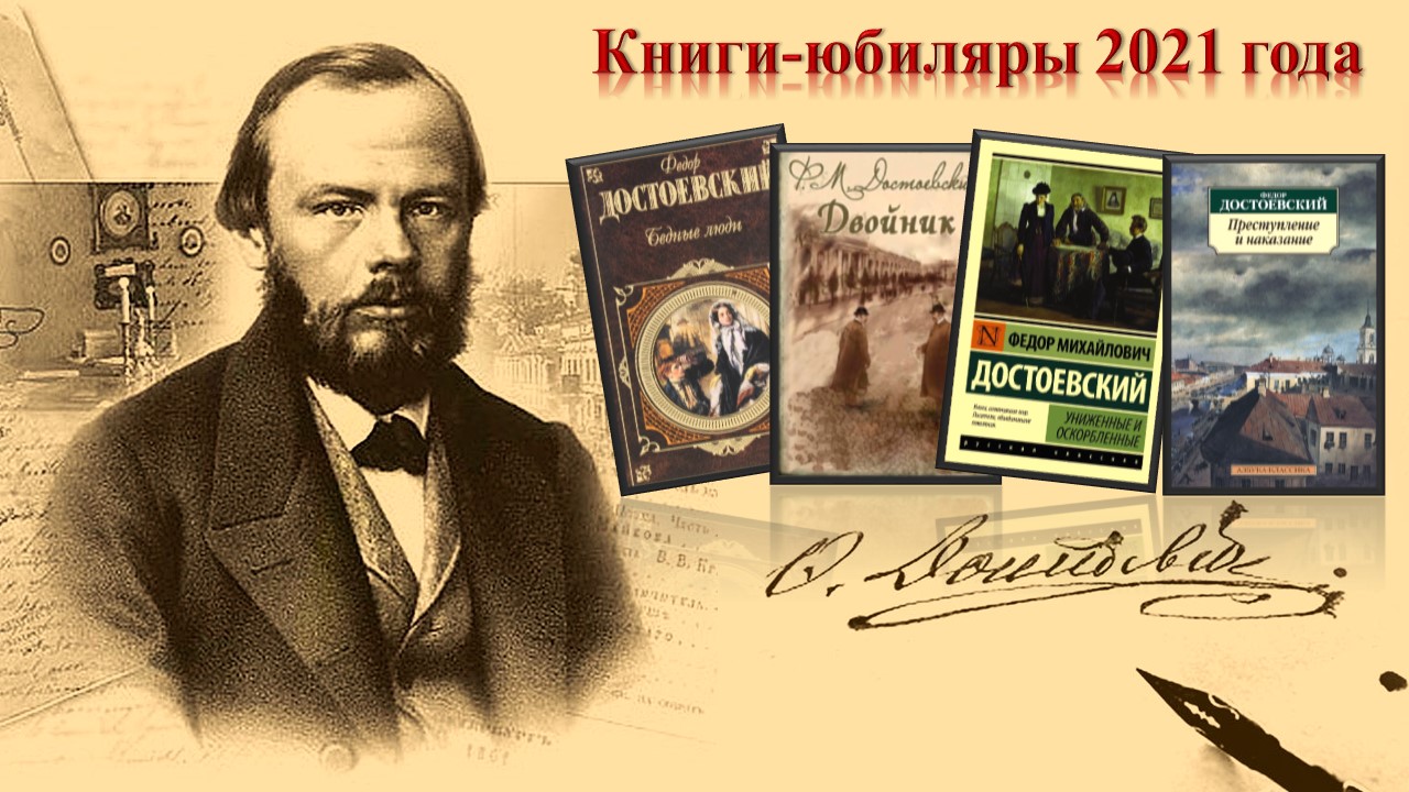 В 2021 году исполняется 200 лет со дня рождения великого русского писателя Фёдора Михайловича Достоевского (1821-1881), чьё творчество оказало огромное влияние не только на русскую, но и на мировую литературу. Юбилей в этом году не только у Ф. М. Достоевского, но и у нескольких его произведений – это романы «Бедные люди» (175 лет) и «Двойник» (175 лет), «Униженные и оскорбленные» (160 лет), «Преступление и наказание» (155 лет) и «Игрок» (155 лет), который был написан во время работы над книгой «Преступление и наказание». Истории их создания мы посвящаем нашу выставку-просмотр «Романы Ф. Достоевского – юбиляры 2021 года».