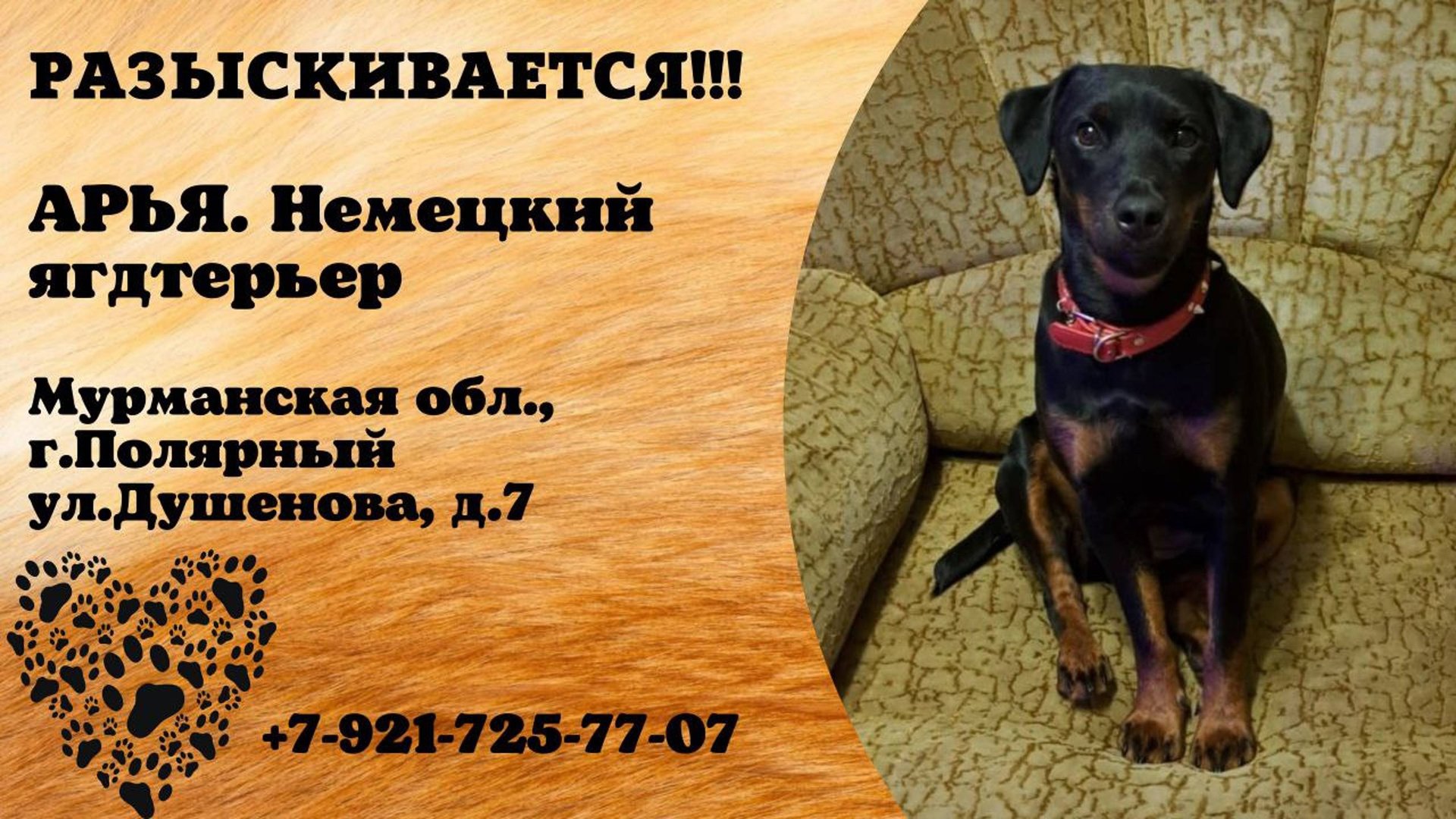 Пропала собака! АРЬЯ. Немецкий ягдтерьер. Мурманская обл, г. Полярный