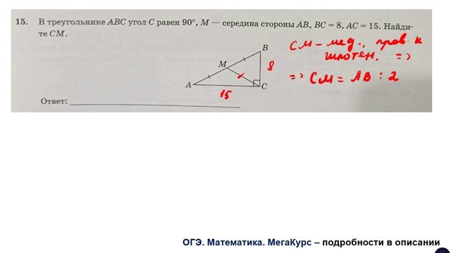 Задание 15. В треугольнике АВС угол С равен 90 градусам, М - середина стороны АВ, ВС = 8, АС = 15. Найдите СМ. Тема задания - треугольник Группа ВК для подготовки к ОГЭ: https://vk.com/secretroom2023 Видеокурс для подготовки к ОГЭ по математике: https://stepik.org/a/193288