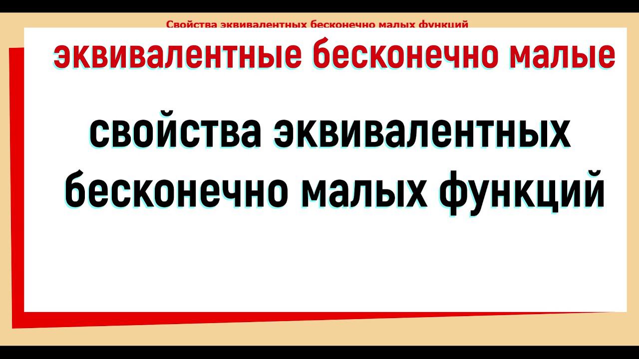 В этом видео: Что такое эквивалентные бесконечно малые функции ? Свойства эквивалентных бесконечно малых функций с доказательство. Условие эквивалентности бесконечно малых функций. Чему эквивалентна сумма бесконечно малых ? Что такое главная часть суммы ? Что значит отбрасывание бесконечно малых высшего порядка ? Здесь это используется: 40. Сравнение бесконечно малых / о малое и О большое https://youtu.be/qAodLwtZ3pE 25. Бесконечно малые функции https://youtu.be/gOEuNGPgkck Все видео по теме ПРЕДЕЛ ПОСЛЕДОВАТЕЛЬНОСТИ, ПРЕДЕЛ ФУНКЦИИ здесь: https://www.youtube.com/playlist?list=PLGtfmJuN1mTD2ND-zeBWHv3ACO5J0G9DR Загляни на канал! Там ещё много полезного, ОБЯЗАТЕЛЬНО ПРИГОДИТСЯ !!! Спасибо за просмотр! . . .