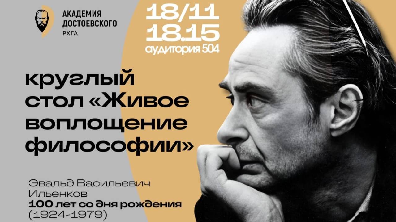 18 ноября 2024 г. в один из «Дней философии в Санкт-Петербурге» состоялось заседание круглого стола "Живое воплощение философии", посвященное столетию с даты рождения Эвальда Васильевича Ильенкова, известного советского философа и педагога. Ведущим круглого стола стал Андрей Николаевич Муравьев, профессор кафедры истории философии СПбГУ, лично знавший Эвальда Васильевича. Ректор РХГА Дмитрий Кириллович Богатырев в своем вступительном слове отметил важность осознанного изучения наследия советских философов. Именно такие мыслители, как Эвальд Васильевич, по мнению Дмитрия Кирилловича, стали в свое время проводниками классической философии в советских университетах. С интерпретацией философской и педагогической теории Ильенкова выступил профессор, доктор философских наук, профессор РХГА Дмитрий Владимирович Масленников. В обсуждении личности и философского наследия Э.В. Ильенкова приняли участие и молодые исследователи. Запись вэб-трансляции.