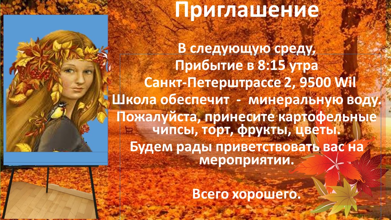 Приглашение на праздник. Мы закончили изучать разговорный курс немецкого языка и руководство школы подготовили для нас сертификаты и будут вручать в торжественной обстановке, на празднике.