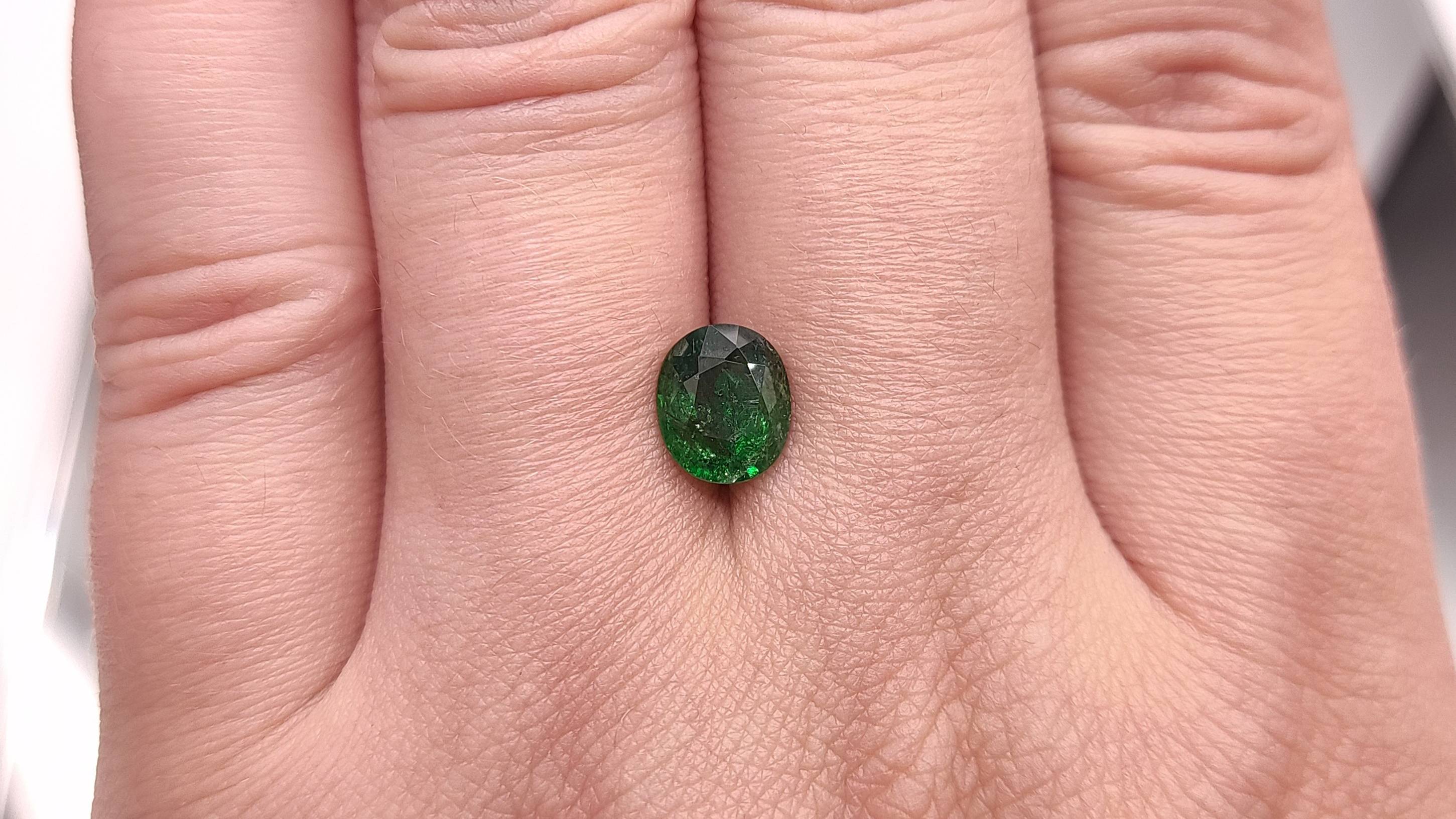 Гранат Цаворит овал 1.98 ct. Место добычи камня - Танзания. 100% природный камень, без облагораживания. Чистота: I1(GIA):Г3 (Ftr). Размер: 8,49 х 7,11 х 3,88 мм. №1427