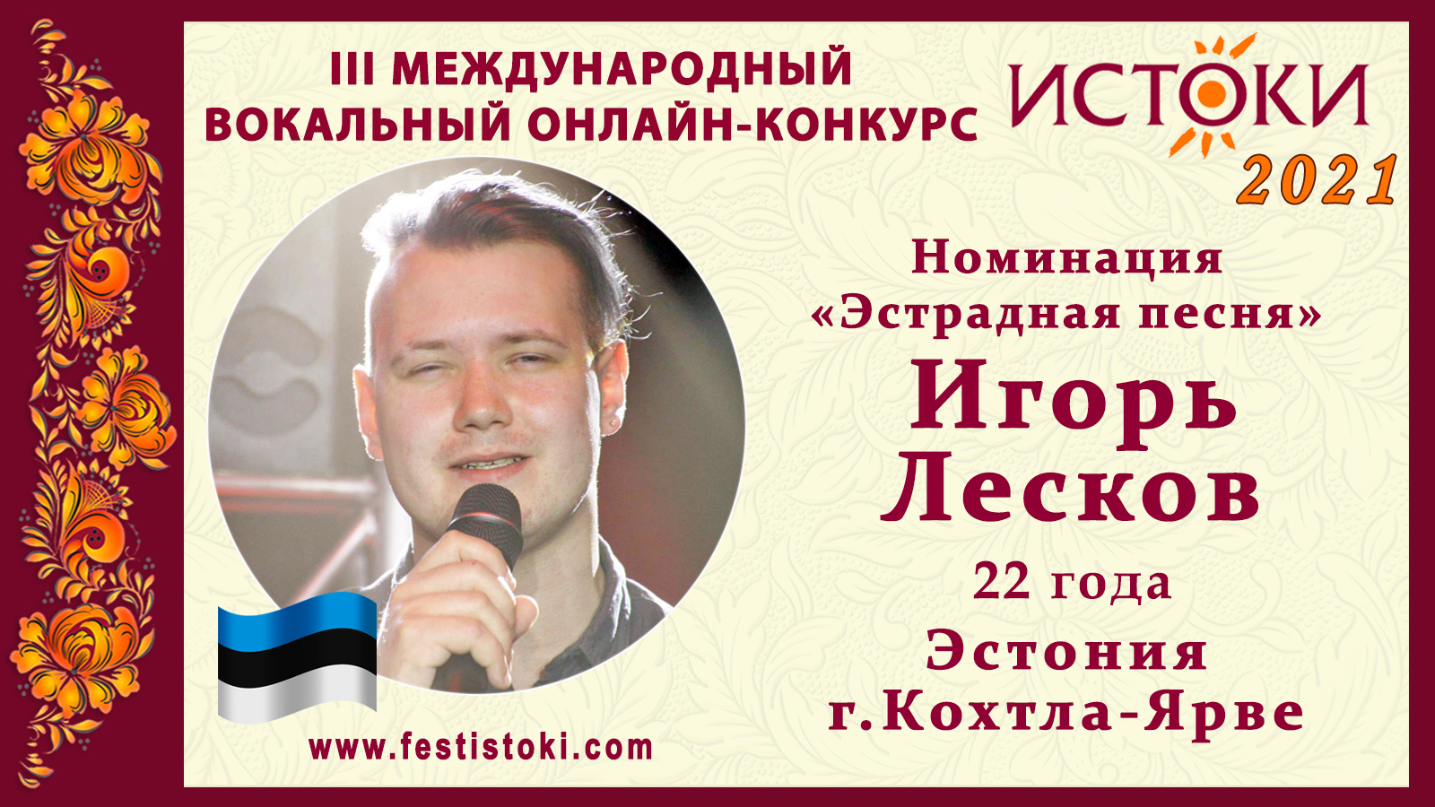 Лауреат III степени III Международного вокального онлайн-конкурса «Истоки». Номинация "Эстрадная песня". Песня "Город" (авторская). Стихи Ольга Пальк и Андрей Соболь. Музыка и аранжировка Артур Бродский. Сайт: www.festistoki.ru / www.festistoki.com E-mail: festistoki@mail.ru