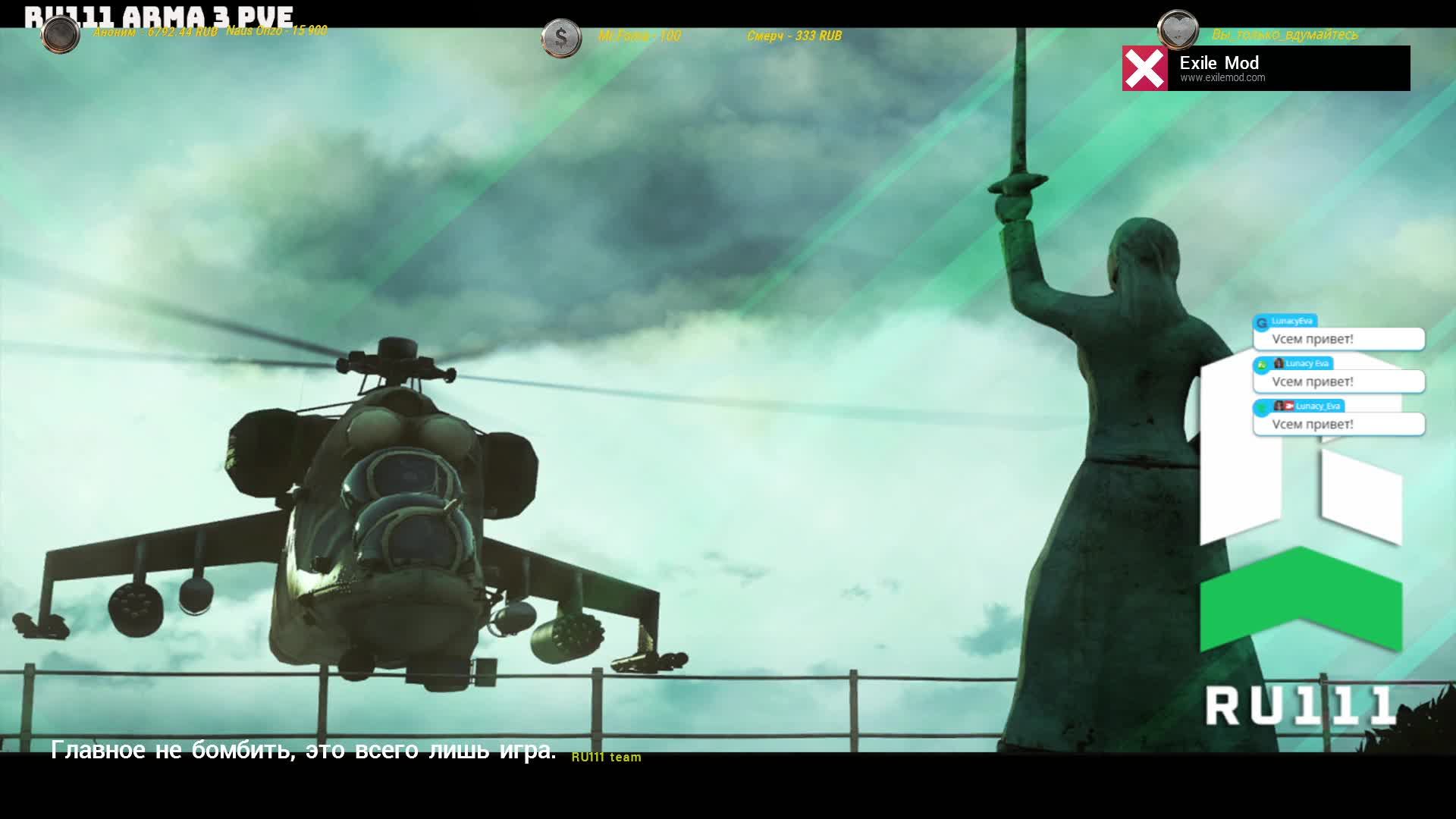 Сервер PVE ALTIS Exile IP: 109.173.73.13:2702 (3ч.рестарты) #Exile #ExilePVE #RU111 #ARMA3Exile #эксайл #ARMA3 #АРМА3 #lunacyeva #lunacy #eva Мой дискорд https://discord.gg/gkzhHWMW7g Я на VK Видео https://vk.ru/video/@evachannel Я на Goodgame https://goodgame.ru/channel/LunacyEva Я на Rutube https://rutube.ru/channel/1157921/ Я на Trovo https://trovo.live/Lunacy_Eva Я на Twitch https://www.twitch.tv/lunacyeva Я на Youtube https://www.youtube.com/@LunacyEva/ Для комплиментиков =)) ! С озвучкой на стриме: https://donatepay.ru/don/Eva http://www.donationalerts.ru/r/lunacyeva Или в тихушку - карта Сбербанка: 2202 2062 0178 2799 В чате стрима приветствуется: - Шутки, песни, анекдоты; - Советы и жалобы=) ; - Капсить можно, но учтите бот не зачитывает капс! В чате не приветствуется: - Ругаться матом; - Прямо и косвенно оскорблять других пользователей в чате; - Заниматься пропагандой расовой и национальной дискриминации; - Тут не место для политики. Моя железяка: https://rutube.ru/video/246cddf42392a20ac6a5e30a0b1dd707/ Проц.: Intel Core i7-7700K 4200 МГц; Видео: GeForce GTX1080; Мат.плата: ASUS ROG STRIX Z270F GAMING; Память: DDR4 32Гб KINGSTON HyperX FURY; 2 SSD: 256 Гб Samsung 850 Pro, 1ТБ Samsung 870 QVO; Жест.диск: 2000 Гб 7200 rpm WDC; Охлаждение: Corsair Hydro H100i; Корпус: Zalman Z9 Neo Black; Гарнитура: HyperX Cloud II; Клавиатура:A4Tech G800 3X Fast Gaming и Ajazz AK820 Pro Мышь: Logitech G102 Мониторы:Samsung S19B370B 18.5 и C32JG51FDI 31.5 Support the stream: https://streamlabs.com/lunacyeva1