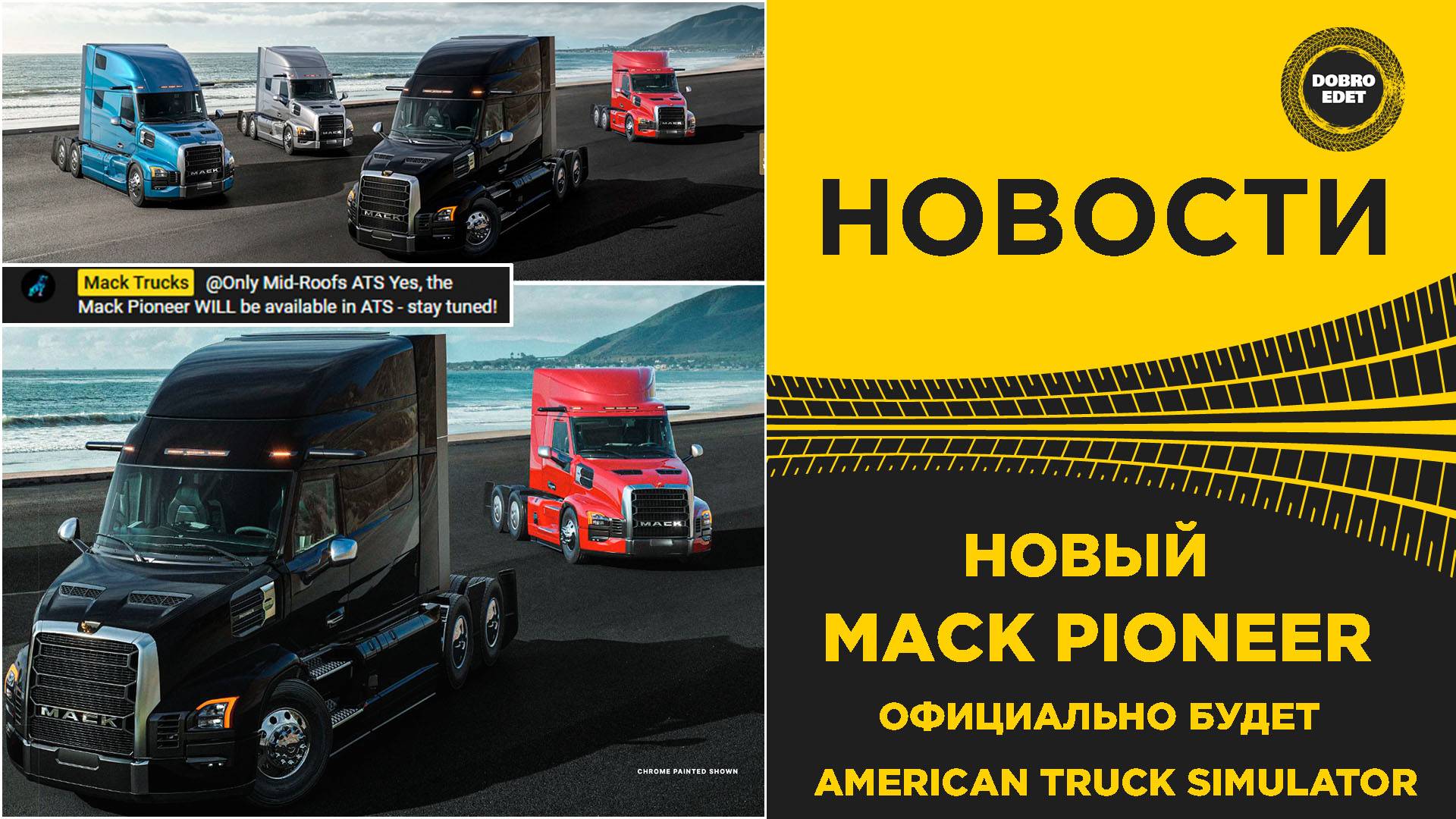 ✅ НОВОСТИ НОВЫЙ MACK PIONEER - ОФИЦИАЛЬНО БУДЕТ В ATS ✅Подписаться на мой канал● https://goo.gl/pFdnLk ====================================================== Крупнейший Американский Производитель грузовиков MACK , показал вчера прямую трансляцию и новый грузовик MACK PIONEER, который официально подтвердили для игры American Truck Simulator. Скорее всего этот новый грузовик ,уже скоро посетит игру ATS . Будем ждать! ====================================================== ✅По вопросам РЕКЛАМЫ - https://vk.com/topic-151331808_35890784 Это Видео - https://youtu.be/ygZkbSLQi_w ●✅Группа ВК -https://goo.gl/8TZaGy (МОДЫ ETS2,FS17) ●✅Я в ВК -https://vk.com/dobrovolskiy36 ●✅Наш дискорд https://discord.com/invite/8wZnqTUY49 ●✅Телеграм https://t.me/dobroYT ●✅RUTUBE https://rutube.ru/channel/22815033/ ●✅ДЗЕН https://dzen.ru/dobroedetofficial #EuroTruckSimulator2 #AmericanTruckSimulator #ets2 #DrivingAcademy #TruckSimulator #SCSSoftware #ats #TruckDriving #TruckGame #SimulationGames #TruckDriver #BigRig #18Wheeler #HardParking #EuroTruckSimulator2 #Mods #TruckPhysics #RealTruckDriving #VirtualTrucker #ConvoyMode #TruckGameplay #dobroedet