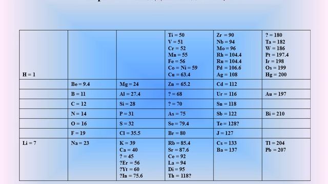 Первые попытки систематизации элементов В 1843 г Леопольд Гмелин привёл таблицу химически сходных элементов, расставленных по группам в порядке возрастания "соединительных масс". Вне групп элементов, вверху таблицы, Гмелин поместил три "базисных" элемента – кислород, азот и водород. Под ними были расставлены триады, а также тетрады и пентады (группы из четырех и пяти элементов), причём под кислородом расположены группы металлоидов (по терминологии Берцелиуса), т.е. электроотрицательных элементов; электроположительные и электроотрицательные свойства групп элементов плавно изменялись сверху вниз. Джон Александр Рейна Ньюлендс в1864 г. опубликовал таблицу элементов, отражающую предложенный им закон октав. Ньюлендс показал, что в ряду элементов, размещённых в порядке возрастания атомных весов, свойства восьмого элемента сходны со свойствами первого. Такая зависимость действительно имеет место для лёгких элементов, однако Ньюлендс пытается придать ей всеобщий характер. В таблице Ньюлендса сходные элементы располагались в горизонтальных рядах; однако, в одном и том же ряду часто оказывались и элементы совершенно непохожие. Кроме того, в некоторых ячейках Ньюлендс вынужден был разместить по два элемента; наконец, таблица Ньюлендса не содержит свободных мест. В 1864 году Уильям Одлинг, пересмотрев предложенную им в 1857 г. систематику элементов, основанную на эквивалентных весах, предложил следующую таблицу, не сопровождаемую какими-либо пояснениями. В 1870 г. Юлиус Лотар Мейер опубликовал свою первую таблицу, в которую включены 42 элемента (из 63), размещённые в шесть столбцов согласно их валентностям. Мейер намеренно ограничил число элементов в таблице, чтобы подчеркнуть закономерное (аналогичное триадам Дёберейнера) изменение атомной массы в рядах подобных элементов. JOIN VSP GROUP PARTNER PROGRAM: https://youpartnerwsp.com/ru/join?92056